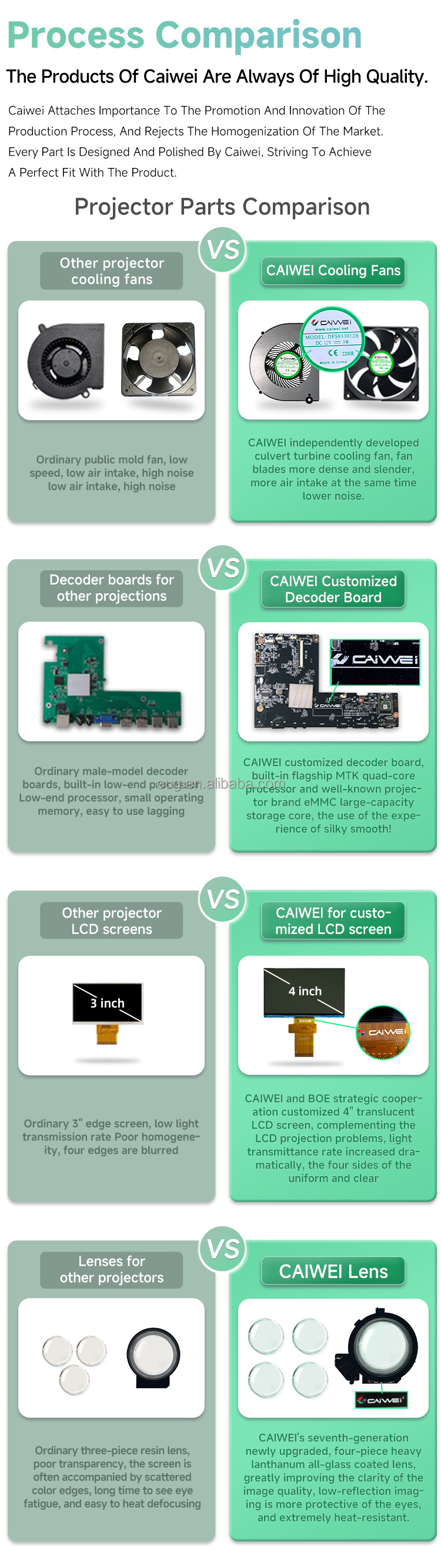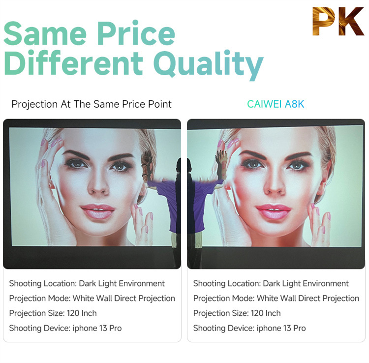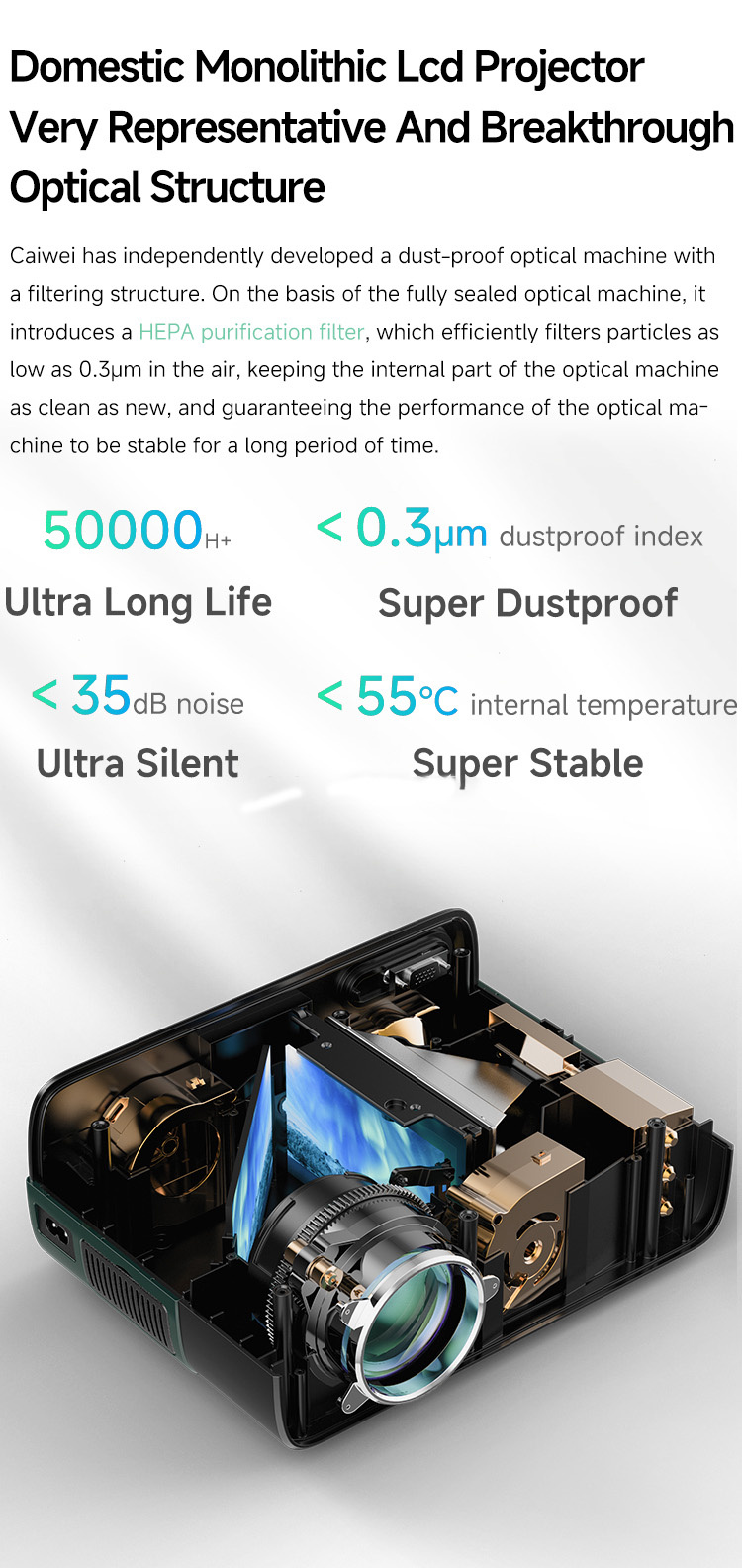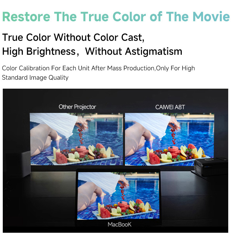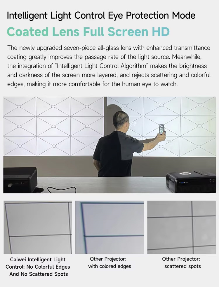 CAIWEI A8K on Google-lisensoitu kotiteatteriprojektori, joka yhdistää 4K-kuvan, helpon automaattisäädön ja sujuvan suoratoiston Android TV -ympäristössä.