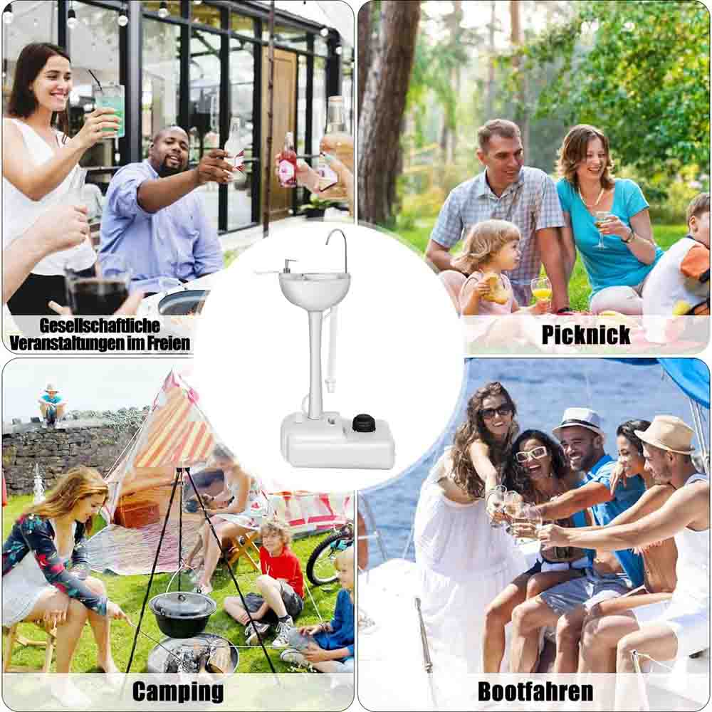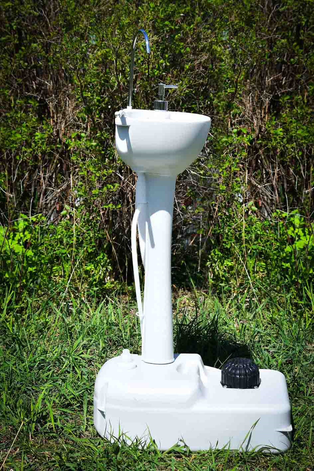 1. Siirrettävä ulkoallas: Jalustan vesisäiliön tilavuus on 19L, joten käytettävissä on kerralla runsaasti vettä käsien pesuun ja muuhun käyttöön leirintäalueella tai matkalla.