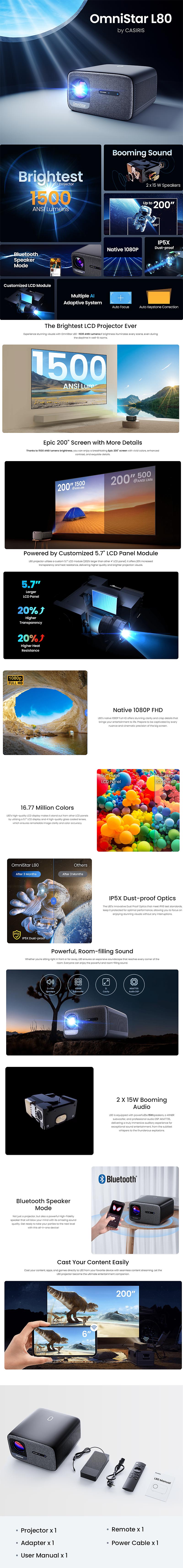1. Korkea kirkkaus ja tarkka kuva: CASIRIS OmniStar L80 tuottaa 1500 ANSI lumenia ja natiivin 1080P Full HD -tarkkuuden, lisäksi 4K-dekoodaus.