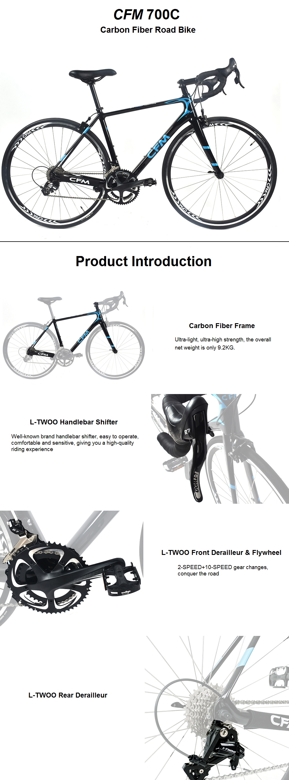 CFM 700C hiilikuiturunko maantiepyörä 2x10-vaihteinen mekaaniset jarrut nettopaino noin 9,2 kg