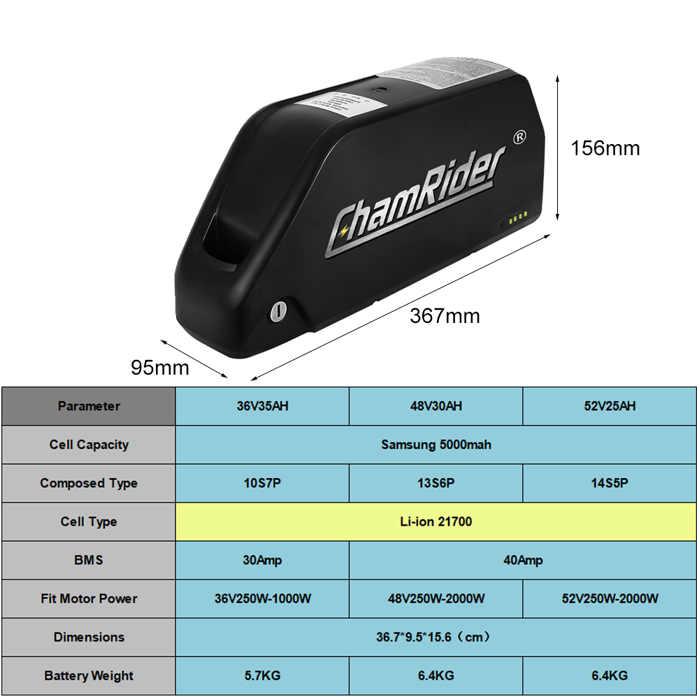 ChamRider Polly C 36V 33.6Ah sähköpyöräakku alaputkeen LG 21700 4800mAh 30A BMS IP65 4A-laturi