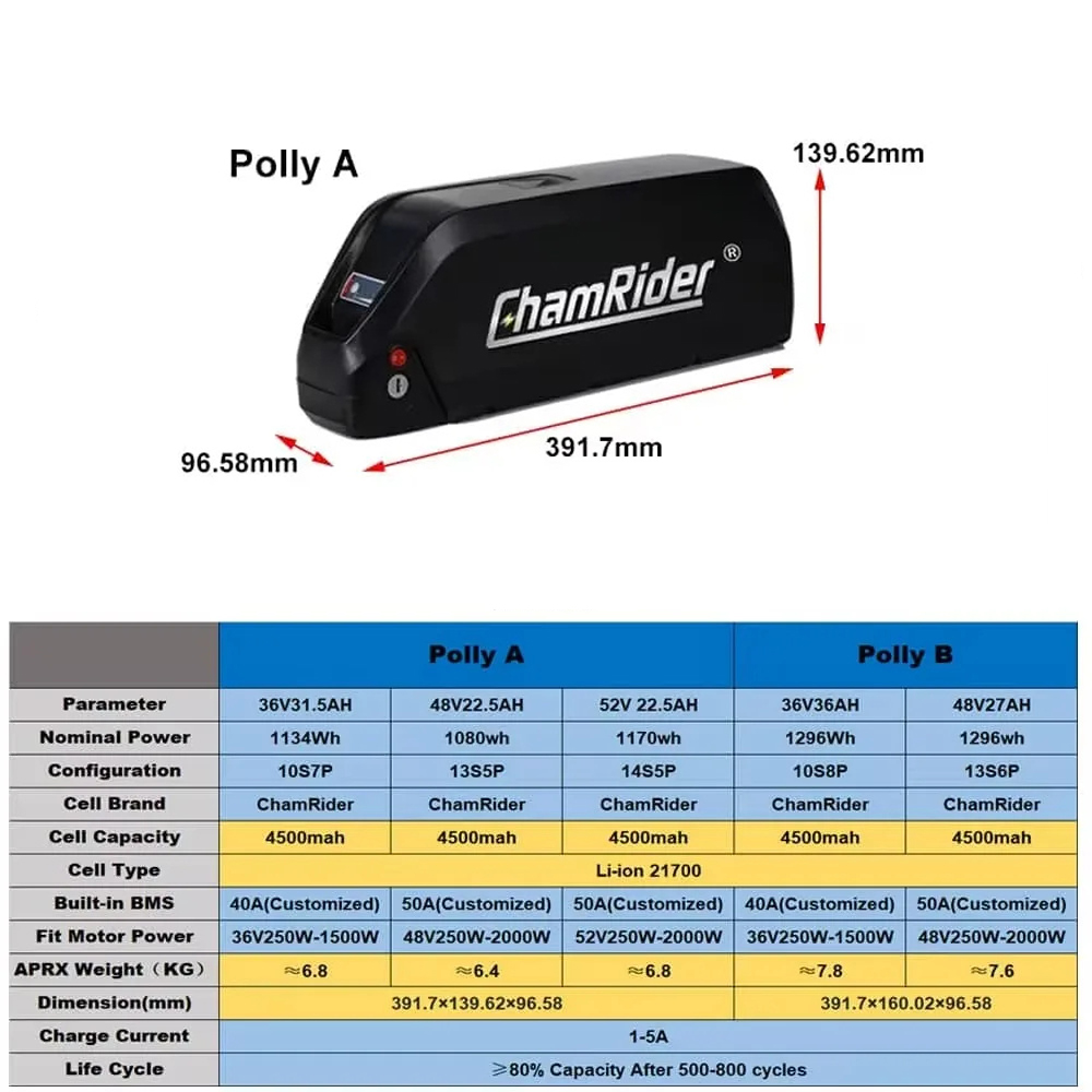 ChamRider Polly A on 52V22.5AH akku, joka tarjoaa 1170Wh energiasisällön ja sopii 52V 250W–2000W sähköpyörän moottoreille. Kompakti kotelo, sisäänrakennettu BMS ja 21700-kennot tuottavat tasaisen suorituskyvyn ja pitkän käyttöiän.