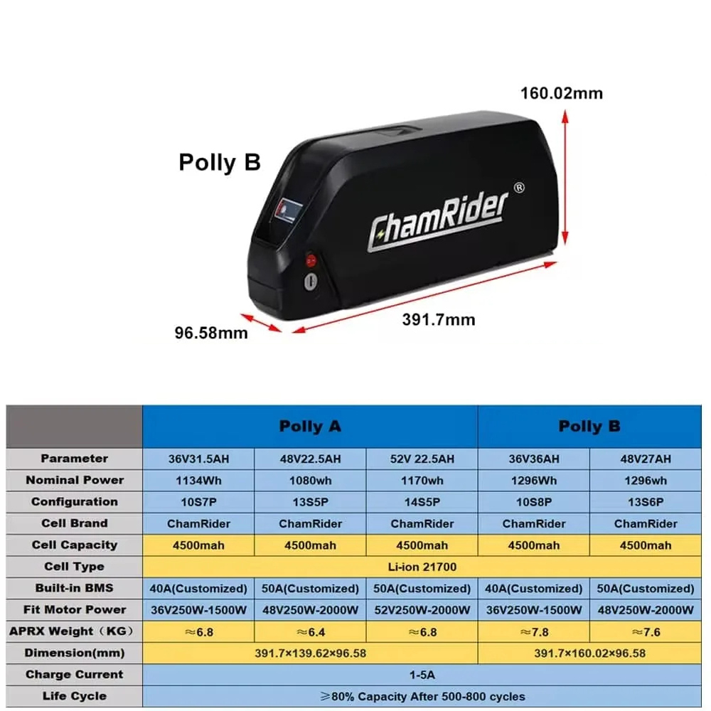 Korkeakapasiteettinen ChamRider Polly B -akku tarjoaa vakaan 36V36AH energian e-pyöräkäyttöön. Kompakti kotelo, sisäänrakennettu suojapiiri (BMS) ja yhteensopivuus 36V 250W–1500W moottorien kanssa tekevät siitä luotettavan valinnan päivittäiseen ajoon.