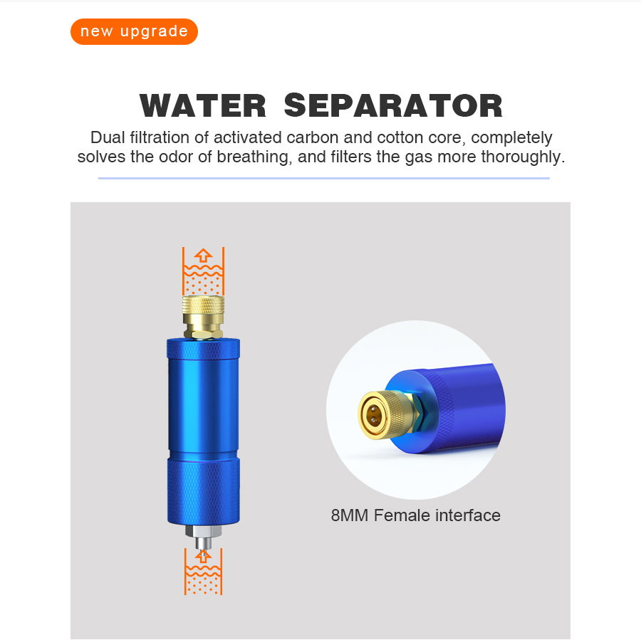 6. Öljy-vesierottimessa on kaksoisaktiivihiilisuodatus ja puuvillaydinsuodatin, jotka vähentävät hengitettävän ilman hajua ja tekevät suodatetusta kaasusta puhtaampaa.