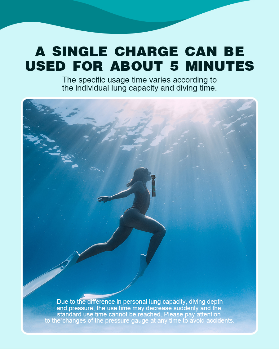 0.5 L säiliön tilavuus mahdollistaa noin 5–7 minuutin hengitysajan veden alla. Todellinen käyttöaika riippuu muun muassa veden lämpötilasta, sukellussyvyydestä ja hengitystiheydestä.