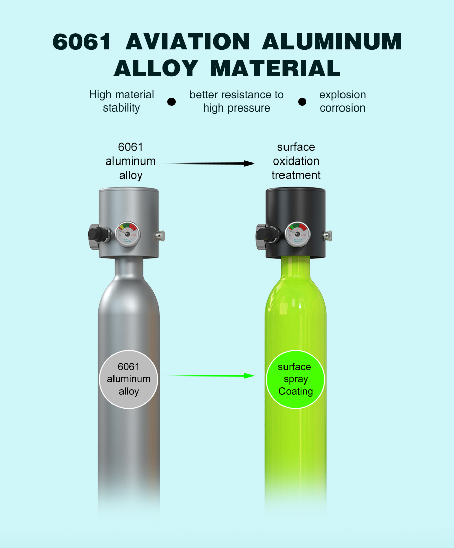Pullo on valmistettu 6061-ilmailualumiinista, jonka seinämän paksuus on 4mm. Materiaali on hyvin hapettumista ja korroosiota kestävää. Työpaine on enintään 3000PSI / 200bar / 20Mpa. Ylipaineen sattuessa räjähdyssuojattu kuparinen turvalevy laukeaa ja laskee painetta, mikä pienentää rikkoutumisriskiä. Tuote on DOT-sertifioitu.