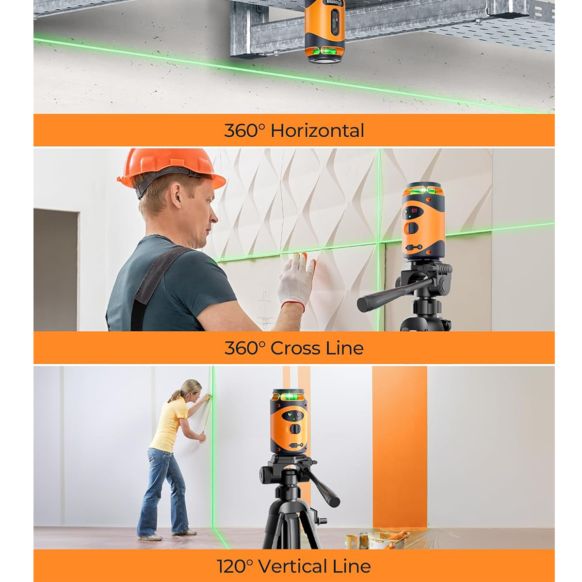 360° vaakasuuntainen ja 180° pystysuuntainen kattavuus: erittäin kirkkaat vihreät säteet tarjoavat täydellisen tasauskattavuuden. Vaaka- ja pystylinjat voidaan projisoida erikseen tai yhdessä eri käyttökohteisiin, kuten hyllyjen, kaappien, laattojen ja listojen asennukseen.