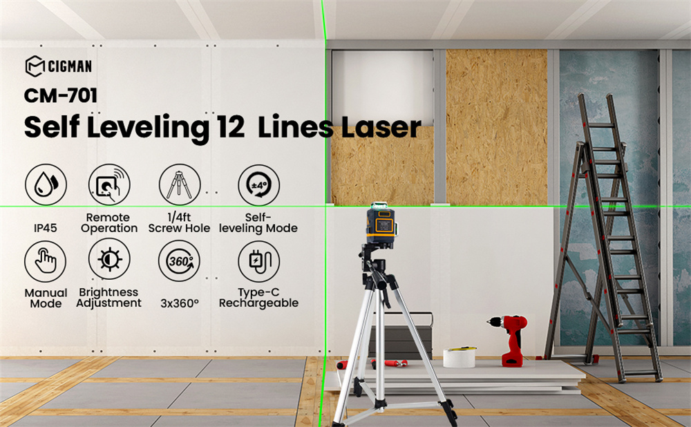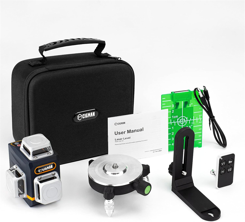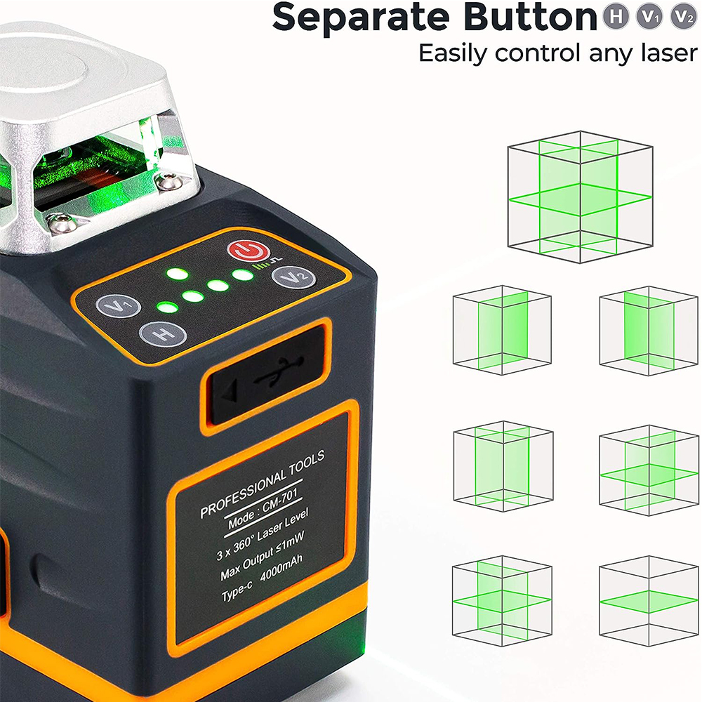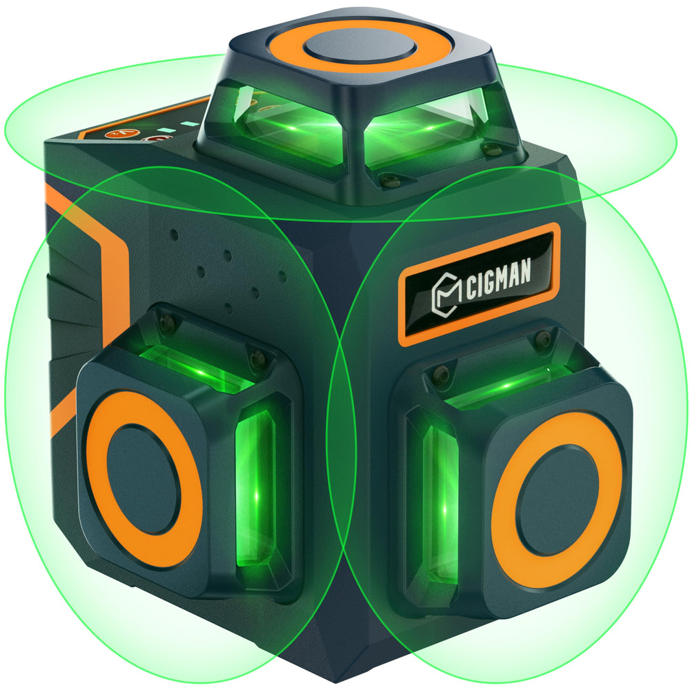 CIGMAN CM-701/CM-701SE 3x360° itsevaaitteleva vihreä linjalaser ladattava akku kauko-ohjain magneettijalusta 30 m työalue