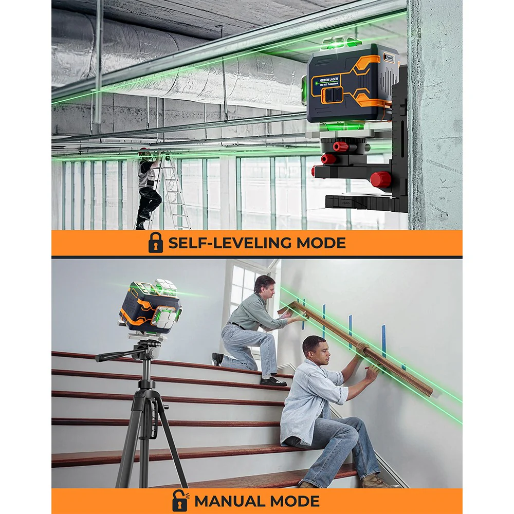 CIGMAN CM-505 vihreä 360-asteinen itsevaaittuva ristiviivalaseri ladattavalla akulla ja jalustolla