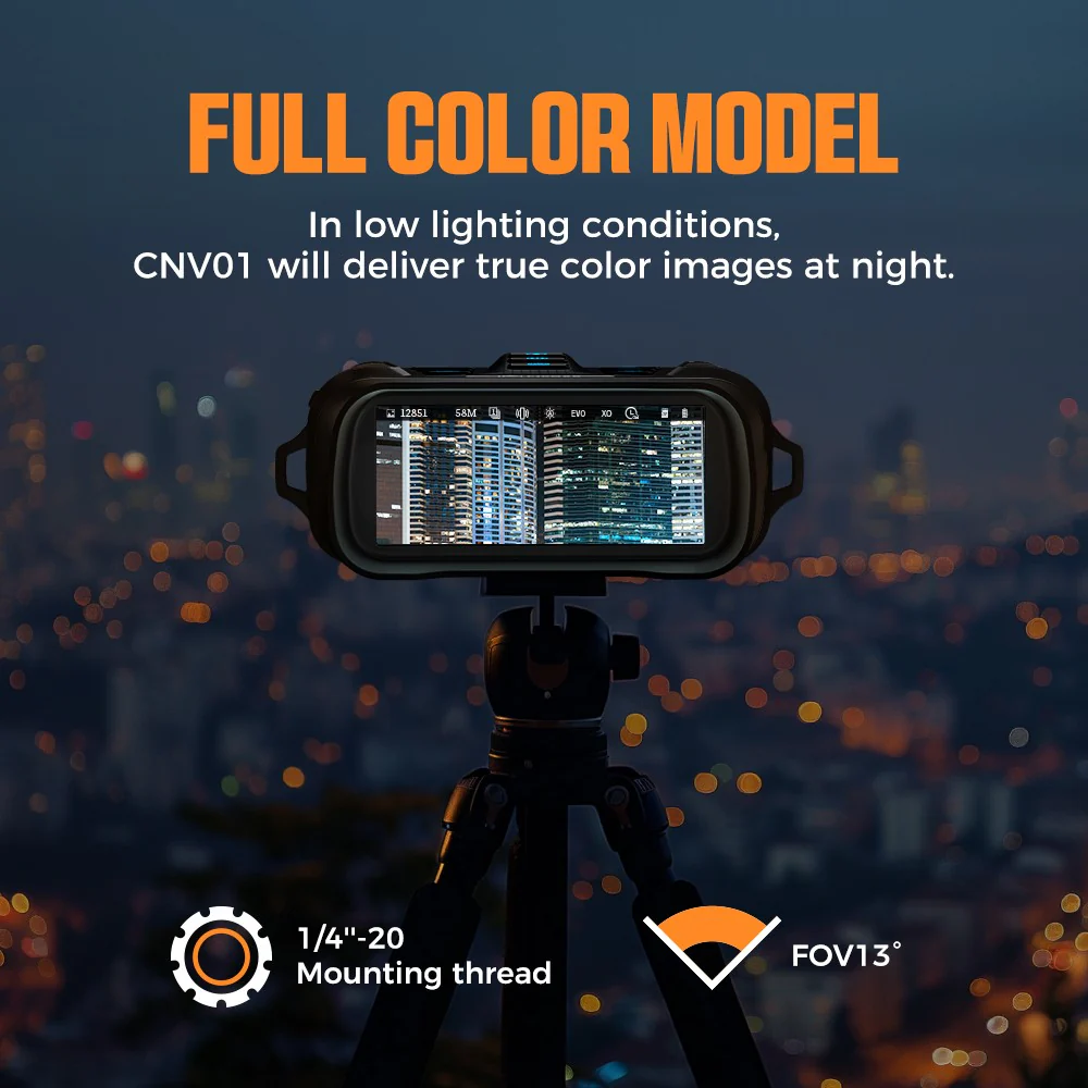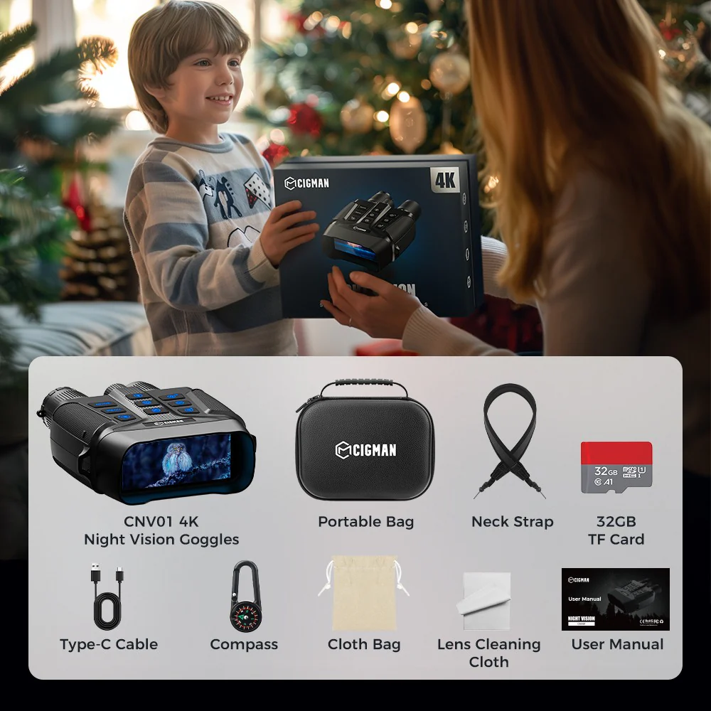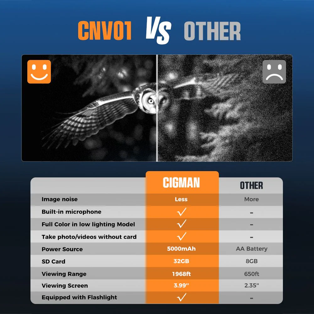 CIGMAN CNV01 4K -yönäkökikareet on suunniteltu hämärässä ja täysin pimeässä tapahtuvaan tarkkailuun, kuvaamiseen ja videoiden tallentamiseen. Starlight-tason sensori, tehokas infrapunavalo ja suuri 3.99-tuumainen näyttö tarjoavat selkeän näkymän pitkälle etäisyydelle sekä päivällä että yöllä.