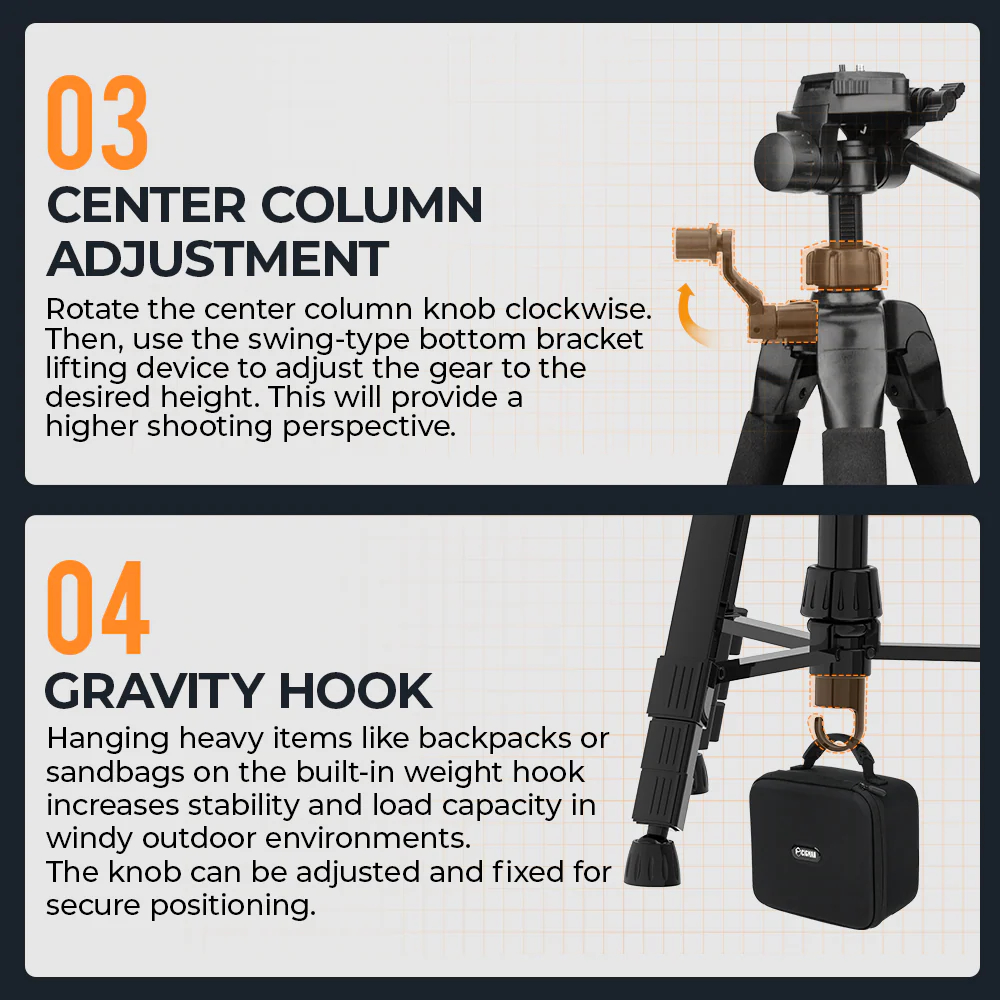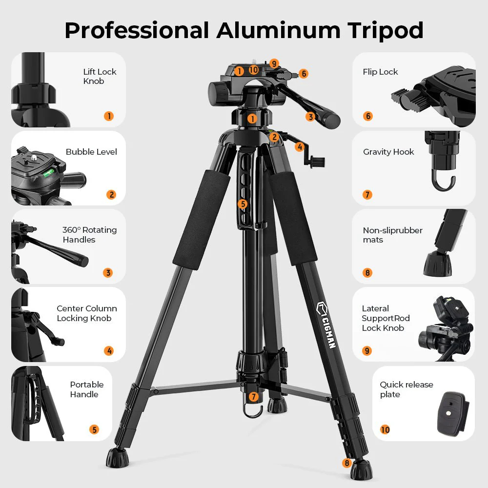 Vankka rakenne: valmistettu alumiinista ja ABS-muovista kestävyyden varmistamiseksi, tarjoaa tukevan alustan. Pakkaukseen sisältyy jalusta, kantolaukku, sovitinmutteri, puhelinpidike ja käyttöohje.