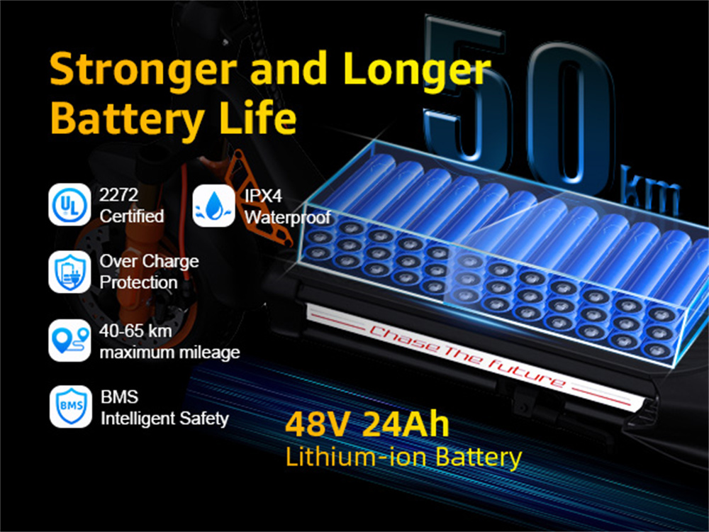 - Akun kapasiteetti 48V 24Ah ja toimintamatka jopa 40–65 km