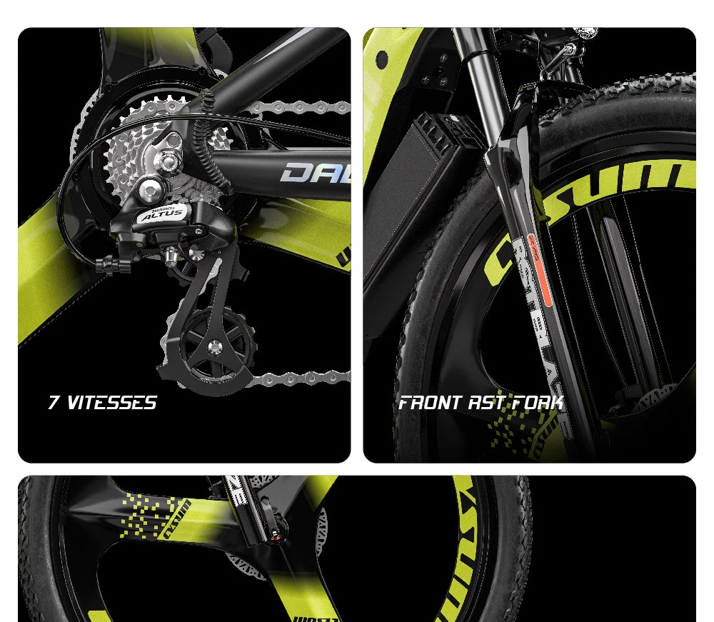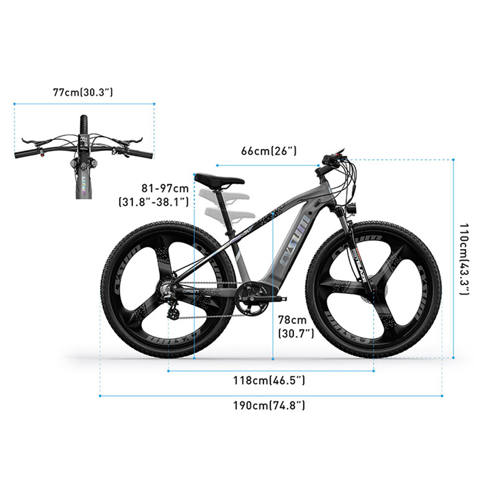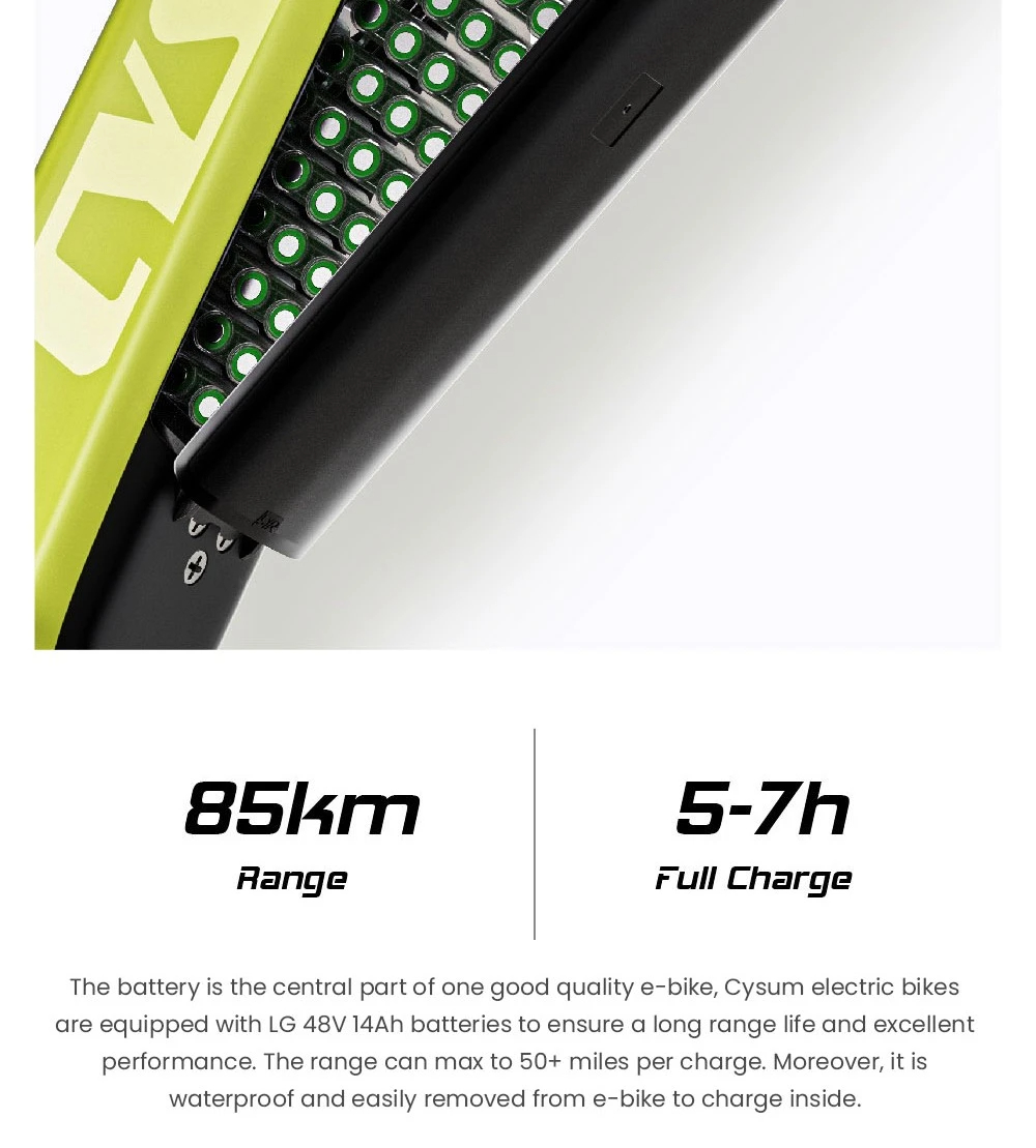 CYSUM CM520 on sähkömaastopyörä, jossa yhdistyvät vankka alumiinirunko, leveät 29-tuumaiset renkaat ja 500W 48V takamoottori. Pitkän kantaman 48V 14AH LG litiumioniakku ja kolmesta ajotilasta valittava avustus tekevät siitä sopivan sekä arkeen että pidemmille retkille.