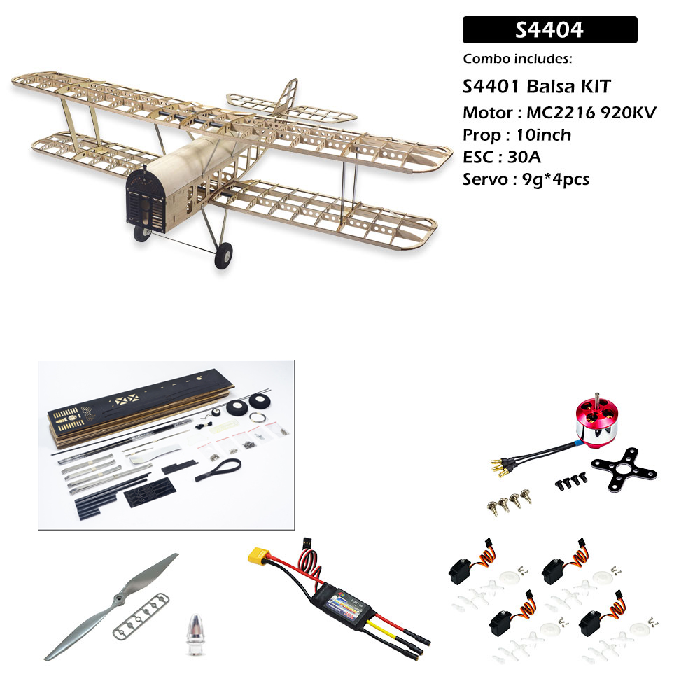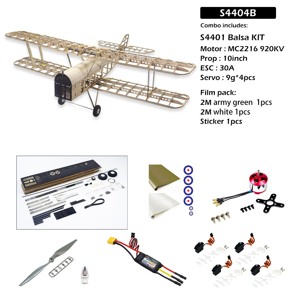 Versiot (valittavissa): KIT + kalvopaketti (S4401B), KIT + moottori + potkuri(t) + servot + nopari (S4404), KIT + moottori + potkuri(t) + servot + nopari + kalvopaketti (S4404B)