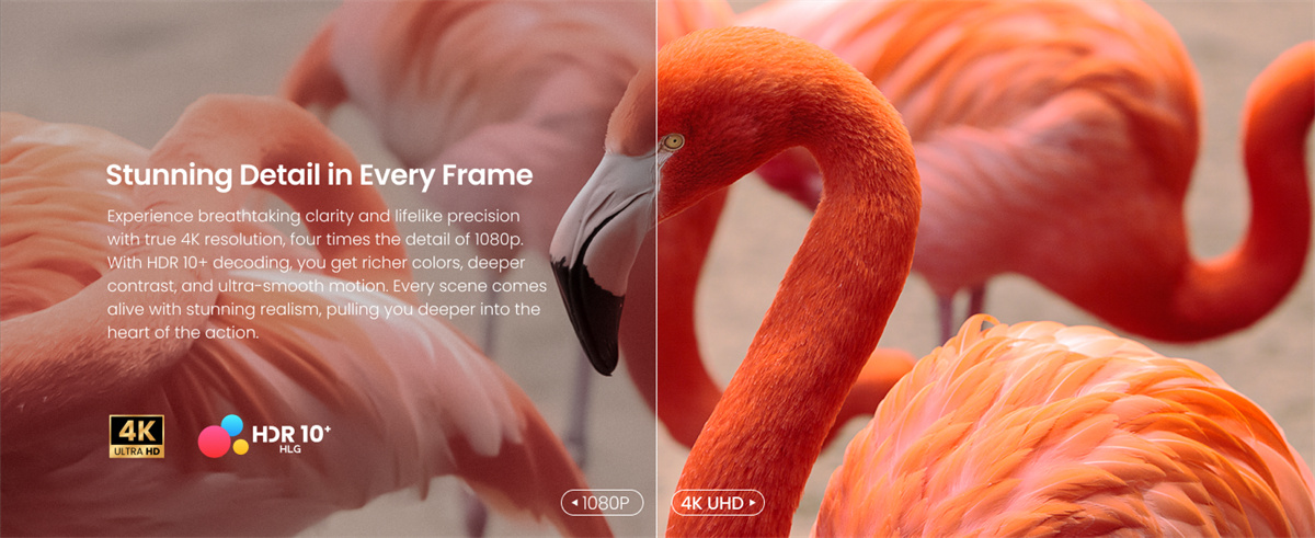 - 4K (3840 × 2160) DLP-kuva, 2000 ISO-lumenia ja HDR10+, HDR 10, HLG