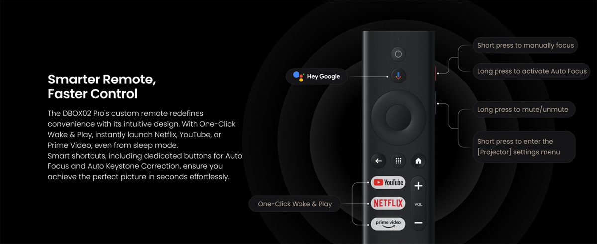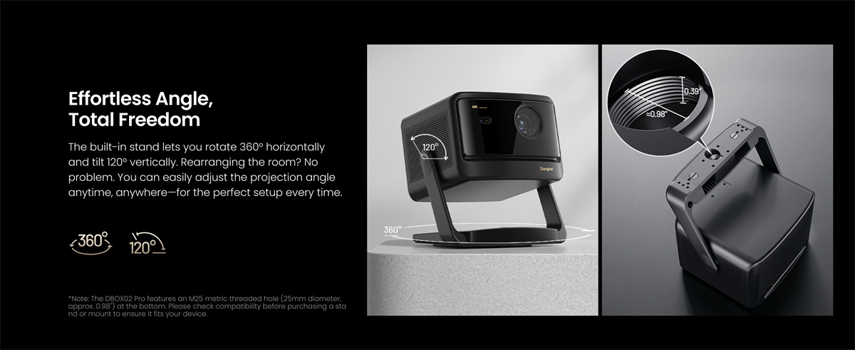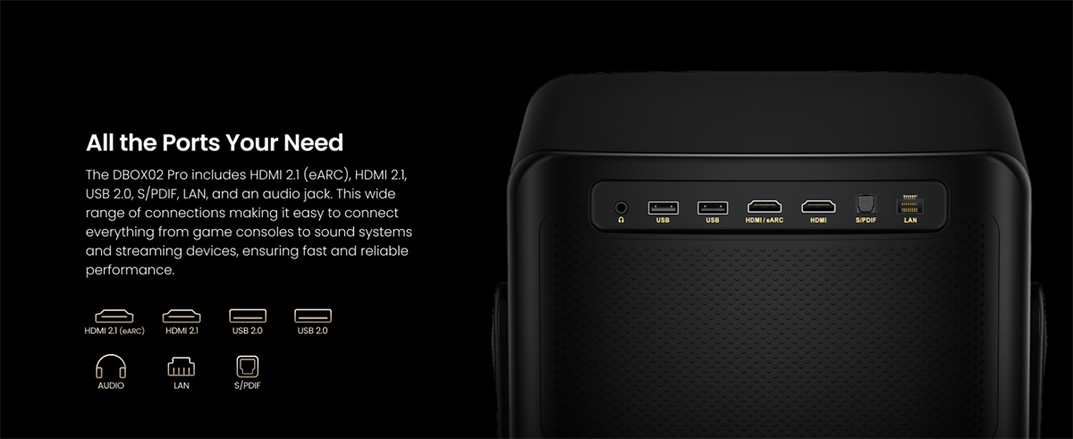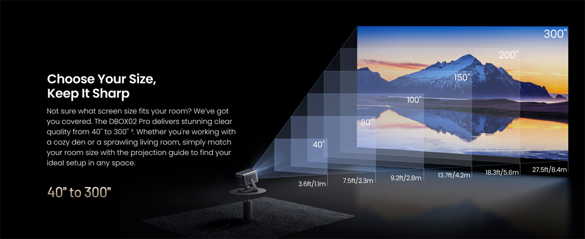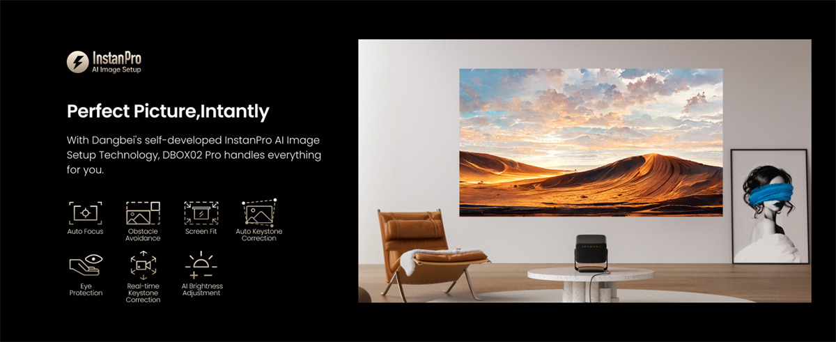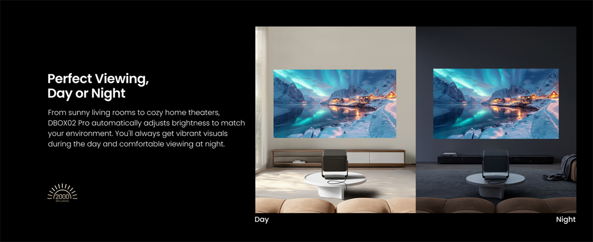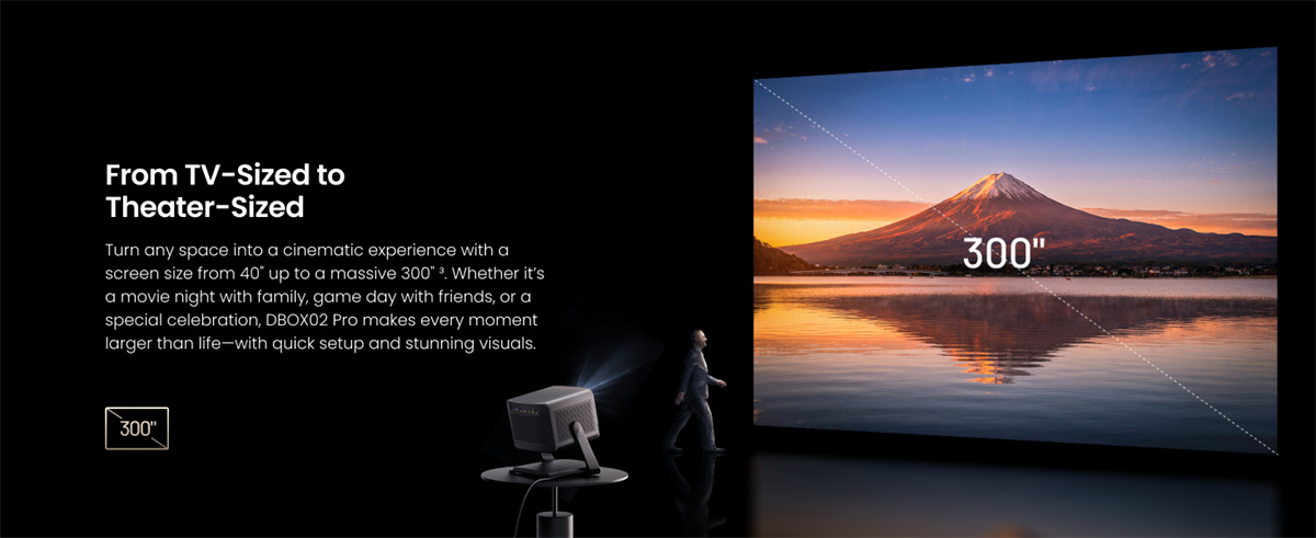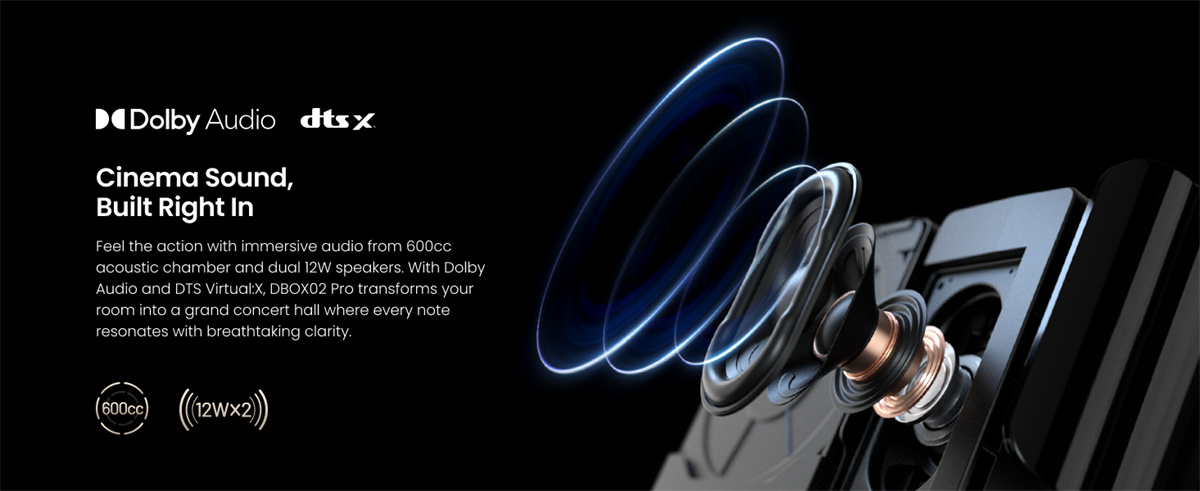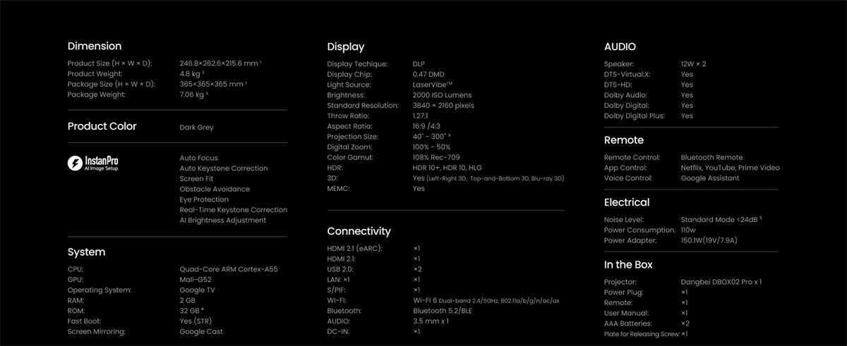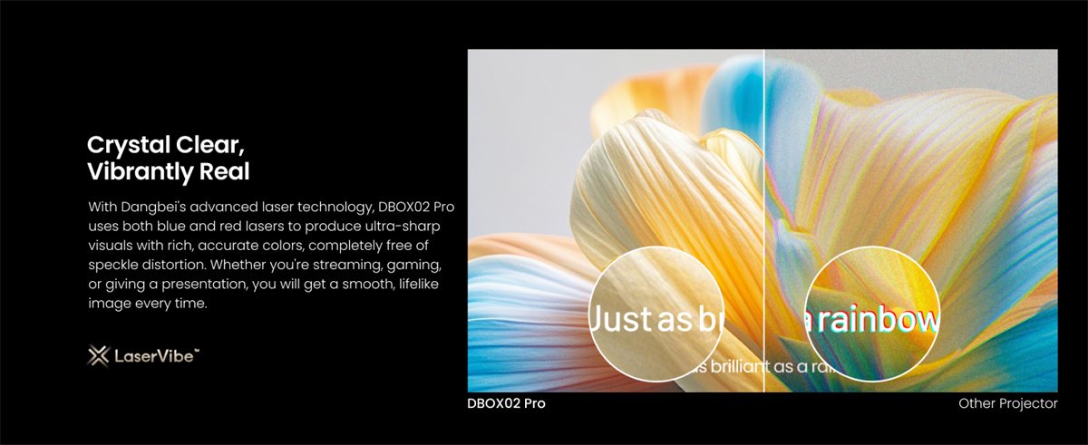 Dangbei DBOX02 Pro on kompakti 4K DLP -projektori LaserVibe-valonlähteellä ja Google TV -käyttöliittymällä. Se tuottaa kirkkaan kuvan (2000 ISO-lumenia), laajat HDR-muodot sekä sujuvan liikkeentoiston. Sisäänrakennetut 12 W × 2 -kaiuttimet tukevat Dolby- ja DTS-ääntä, ja langattomat ominaisuudet, kuten Google Cast, helpottavat sisällön jakamista.