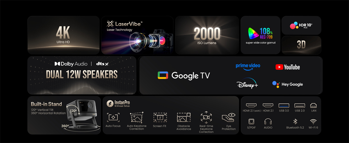 | Näyttö | Näyttötekniikka: DLP Näyttöpiiri: 0.47 DMD Valonlähde: LaserVibe Kirkkaus: 2000 ISO-lumenia Alkuperäinen resoluutio: 3840 × 2160 pikseliä Heittosuhde: 1.27:1 Kuvasuhde: 16:9 / 4:3 Projektiokoko: 40–300 tuumaa Digitaalinen zoom: 100%–50% Väriavaruus: 108% Rec-709 HDR: HDR10+, HDR 10, HLG 3D: kyllä (vasen–oikea 3D, ylä–ala 3D, Blu‑ray 3D) MEMC: kyllä |