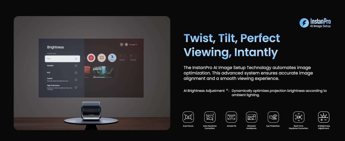 Reaaliaikainen tarkennus, trapetsikorjaus, esteiden väistö ja ympäristön valon mukautus helppoon käyttöönottoon.