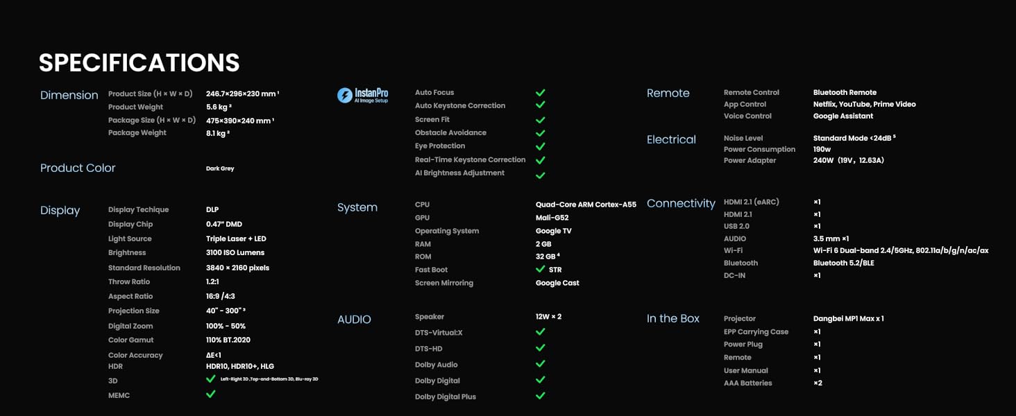| Optiikka ja mekaniikka | Näyttösiru: 0.47 DMD Näyttötekniikka: DLP Valonlähteen käyttöikä: >20000 h Valonlähteen tyyppi: Qualas22*2+2LED ISO-kirkkaus: 3100 lm Resoluutio: 4K (3840x2160) Väriavaruus: BT.2020 110% Kuvavääristymä: H≤+0.5%, V≤0.5% Valon tasaisuus: 85% Heittosuhde: 1.2:1 Kontrasti: minimi 700:1, tyypillinen 900:1 Värikoordinaatit: x=0.29±0.015 y=0.29±0.015 Kuvakoko: 40–180 tuumaa Heittoetäisyys: 2-4.5 m |