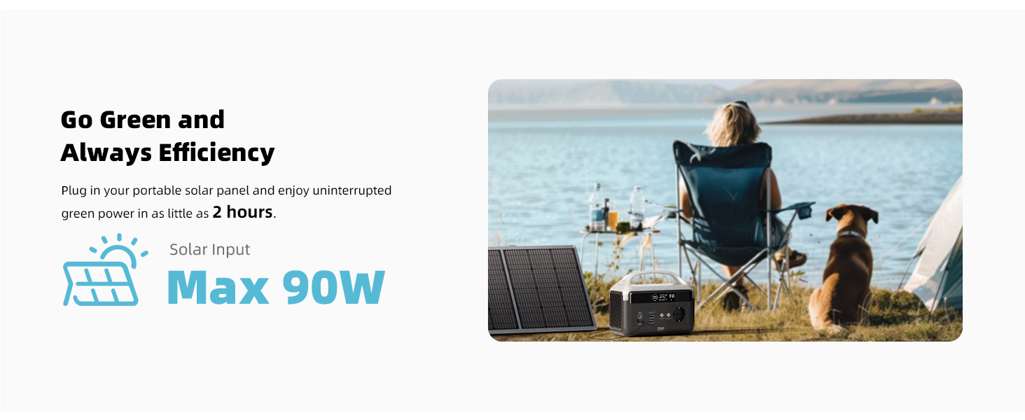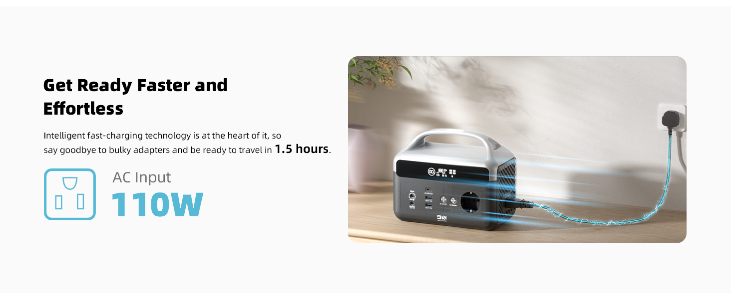 3. Erittäin nopea lataus: Kolme lataustapaa. Täyteen noin 1.5 tunnissa kotipistorasiasta (120W vaihtovirran erittäin nopea lataus) tai noin 2 tunnissa autolaturilla tai aurinkopaneelilla (MPPT enintään 90W (11–30V 4A enintään)).