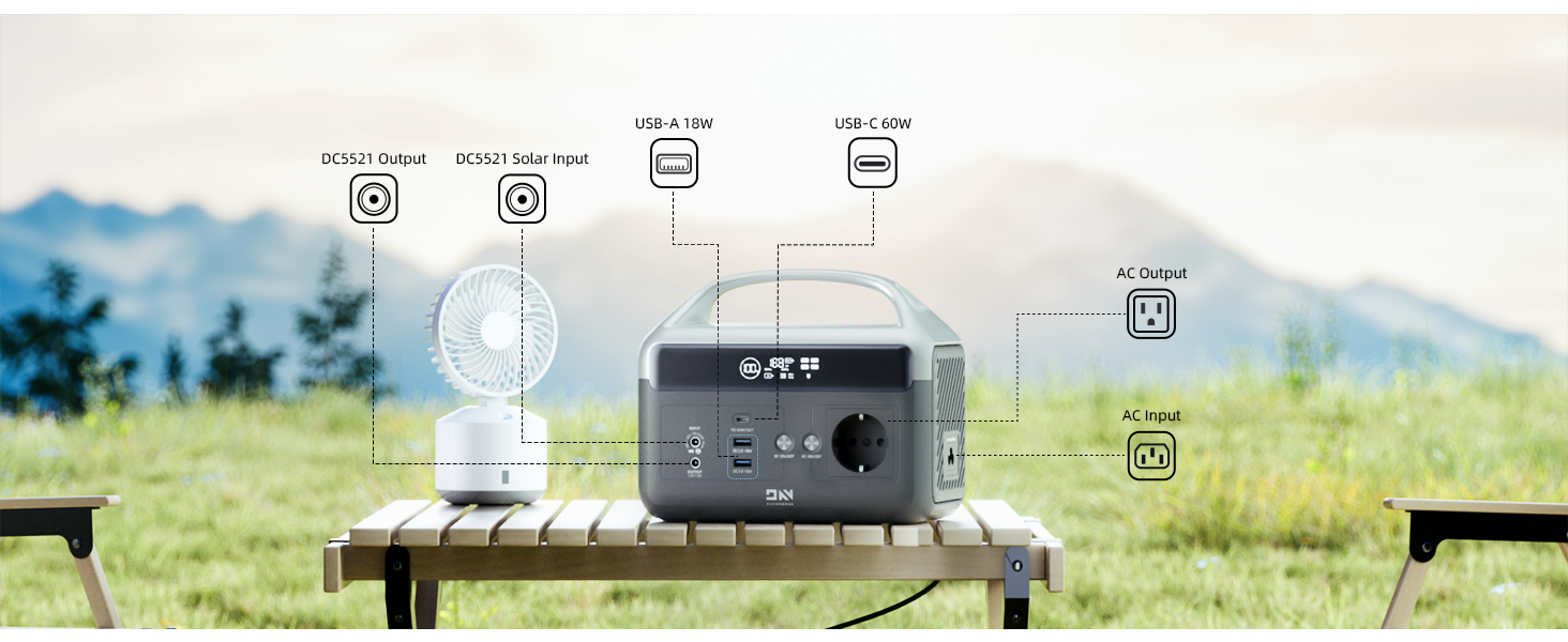 7. Virtaa samanaikaisesti 6 laitteelle: Sopii esimerkiksi drooneille, tableteille, televisioille, autojääkaapeille, matkapuhelimille, iPadeille, kannettaville tietokoneille, kameroille, PS5:lle, CPAP-laitteille jne. Varustettu 1 x vaihtovirtalähdöllä, 1 x USB-C (PD 60W tehokas lähtö), 2 x USB-A (QC3.0 18W tehokas lähtö), 1 x tasavirtalähtö 5.5 (5521). Nämä liitännät kattavat useimpien markkinoilla olevien laitteiden virtatarpeet (huomio: kokonaistehon tulee olla alle 320W).