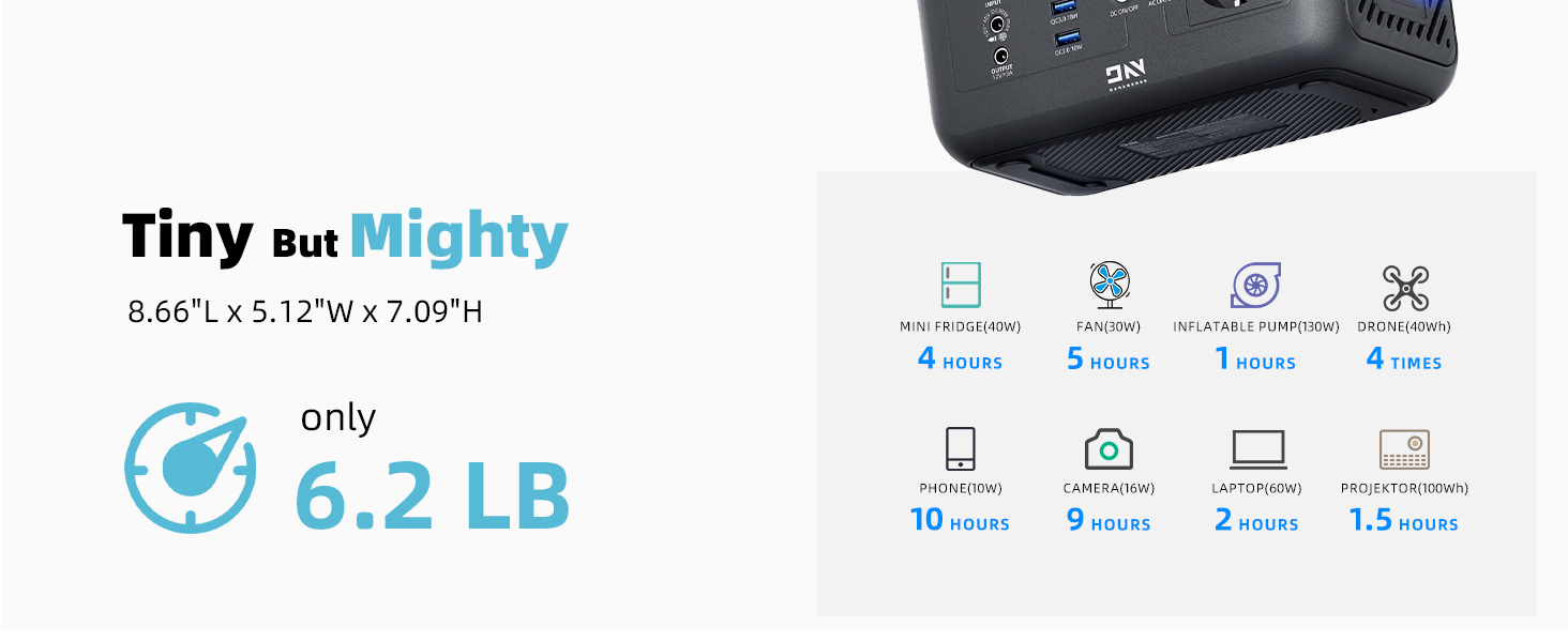 2. Kevyt ja helppo kuljettaa: Pienikokoinen (8.6 x 7 x 5.1 tuumaa) ja kevyt (6.2 lb), kevyempi kuin kaksi kannettavaa tietokonetta ja pienempi kuin leivänpaahdin. Mahtuu helposti reppuun tai laukkuun mukaan, minne tahansa tarvitset virtaa.