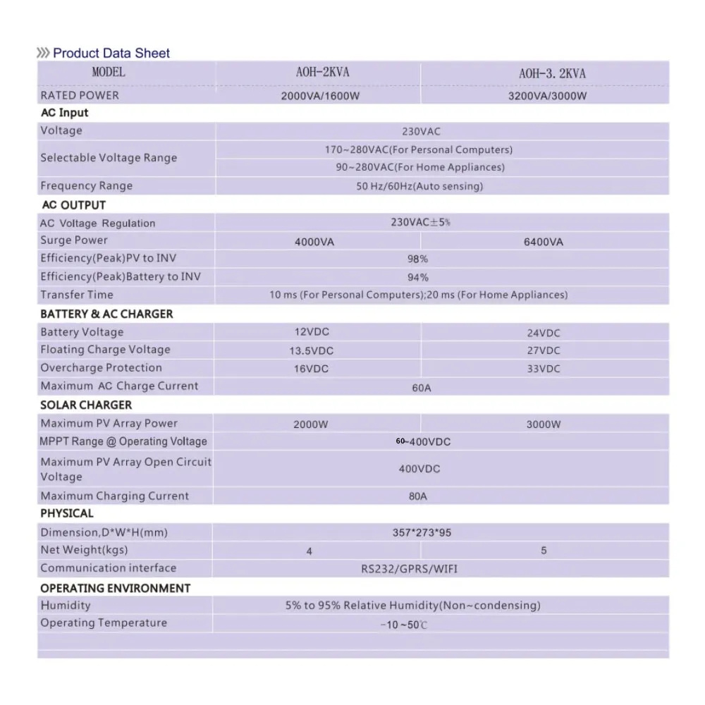 Tämä DAXTROMN AOH-3.2KVA on 3000W/3200VA hybridi-invertteri, jossa on puhdas siniaalto, sisäänrakennettu jopa 80A MPPT-aurinkolataussäädin ja 24V DC -akkutuki. Laite soveltuu sekä tietokoneille että kotitalouslaitteille, ja siinä on korkea hyötysuhde sekä joustava priorisointi aurinkosähkön, akun tai verkon välillä.