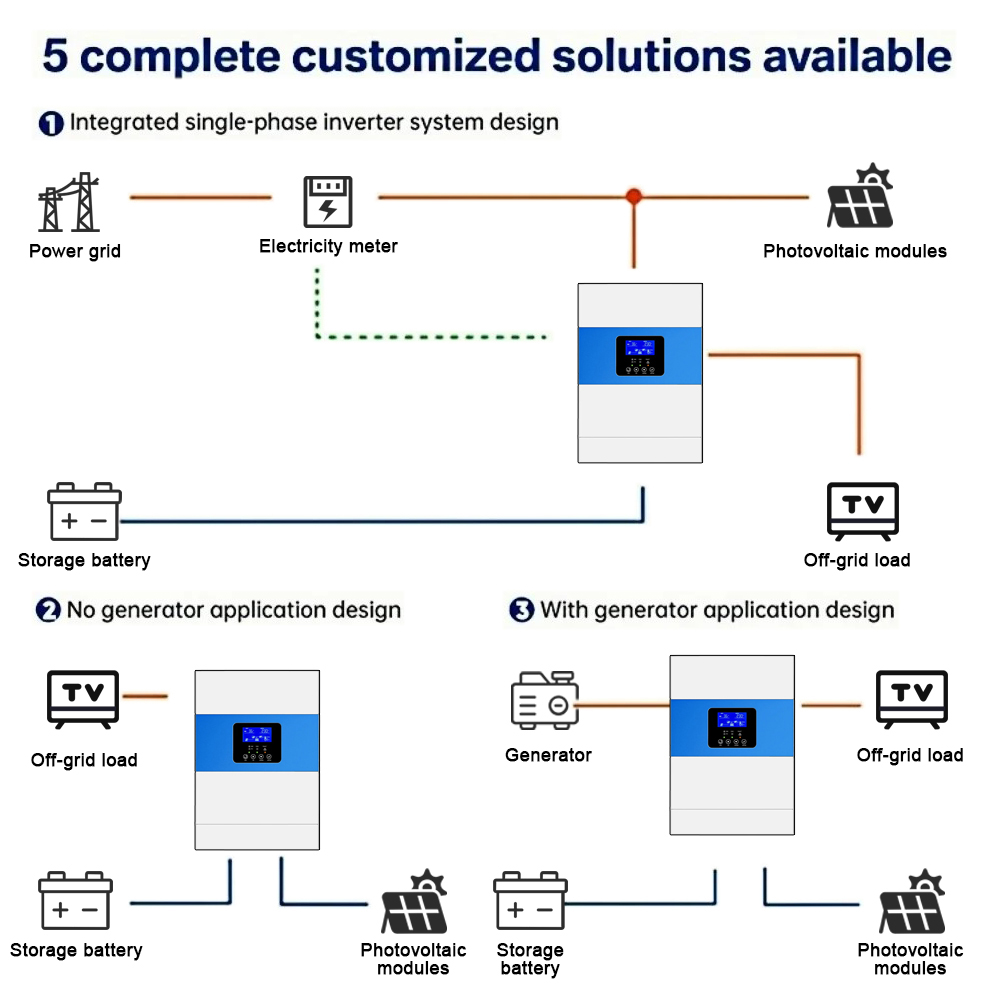 2. Tämä on laajalla jännitealueella toimiva Off Grid / On Grid -aurinkoinvertteri. Jos aurinkoinvertteriä käytetään ilman ulkoista akkua, aurinkopaneelien jännitteen on noustava yli 150V, jotta invertteri toimii normaalisti. Ulkoisen akun kanssa invertteri toimii alkaen 120V jännitteestä.