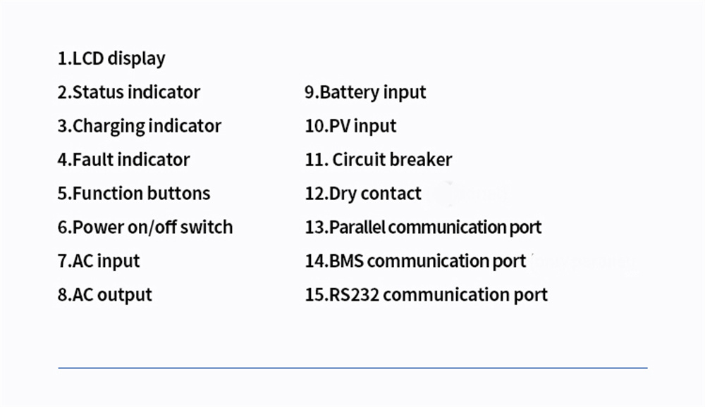 1. Tässä invertterissä on rinnankytkentätoiminto. Jopa 6 yksikköä voidaan kytkeä rinnan. Jos rinnankytkentää ei tarvita, voi käyttää mallia GGH-6.5KVA [ID: 2023218].