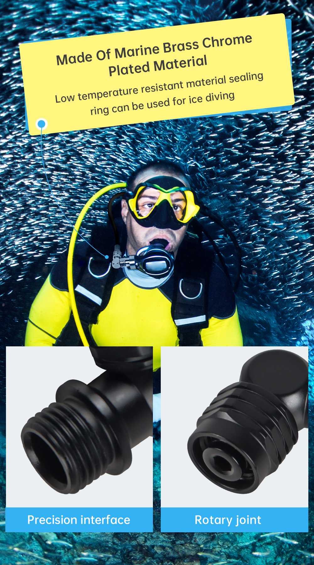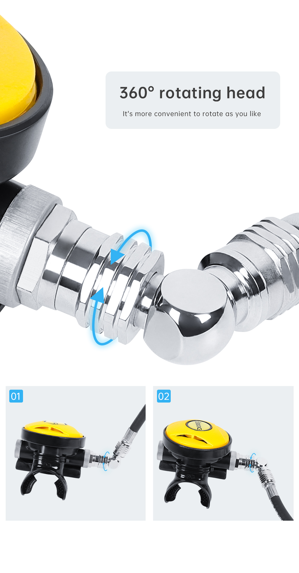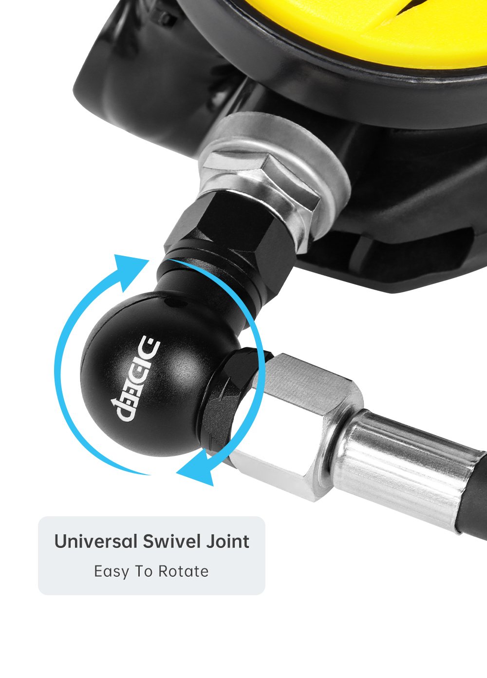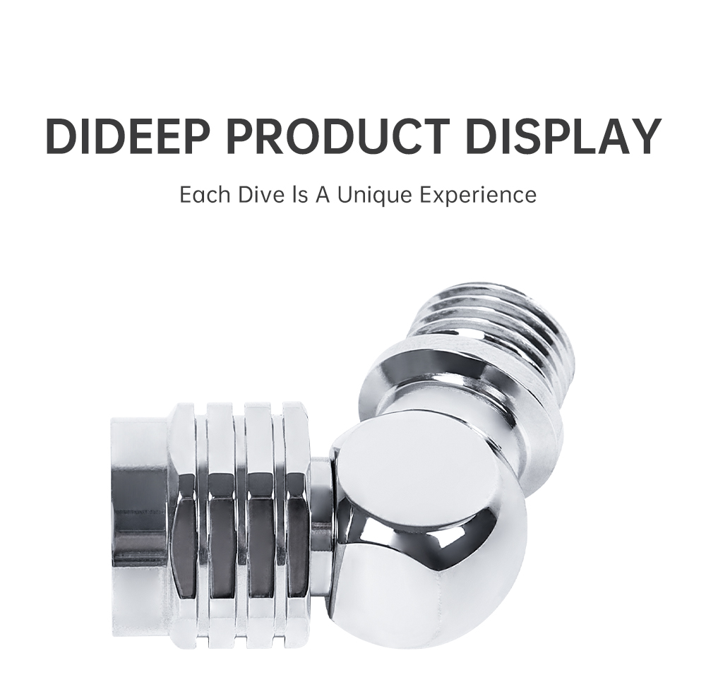 Tämä DIDEEP Scuba Diving Swivel Adapter -liitin parantaa letkun asettelua ja hengitysventtiilin käyttömukavuutta eri sukellustyyleissä. Kestävä, merikäyttöön soveltuva rakenne ja 360 asteen kääntö takaavat joustavan ja turvallisen letkun kulun myös vaativissa olosuhteissa.