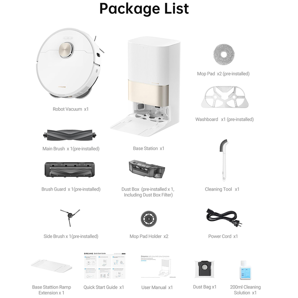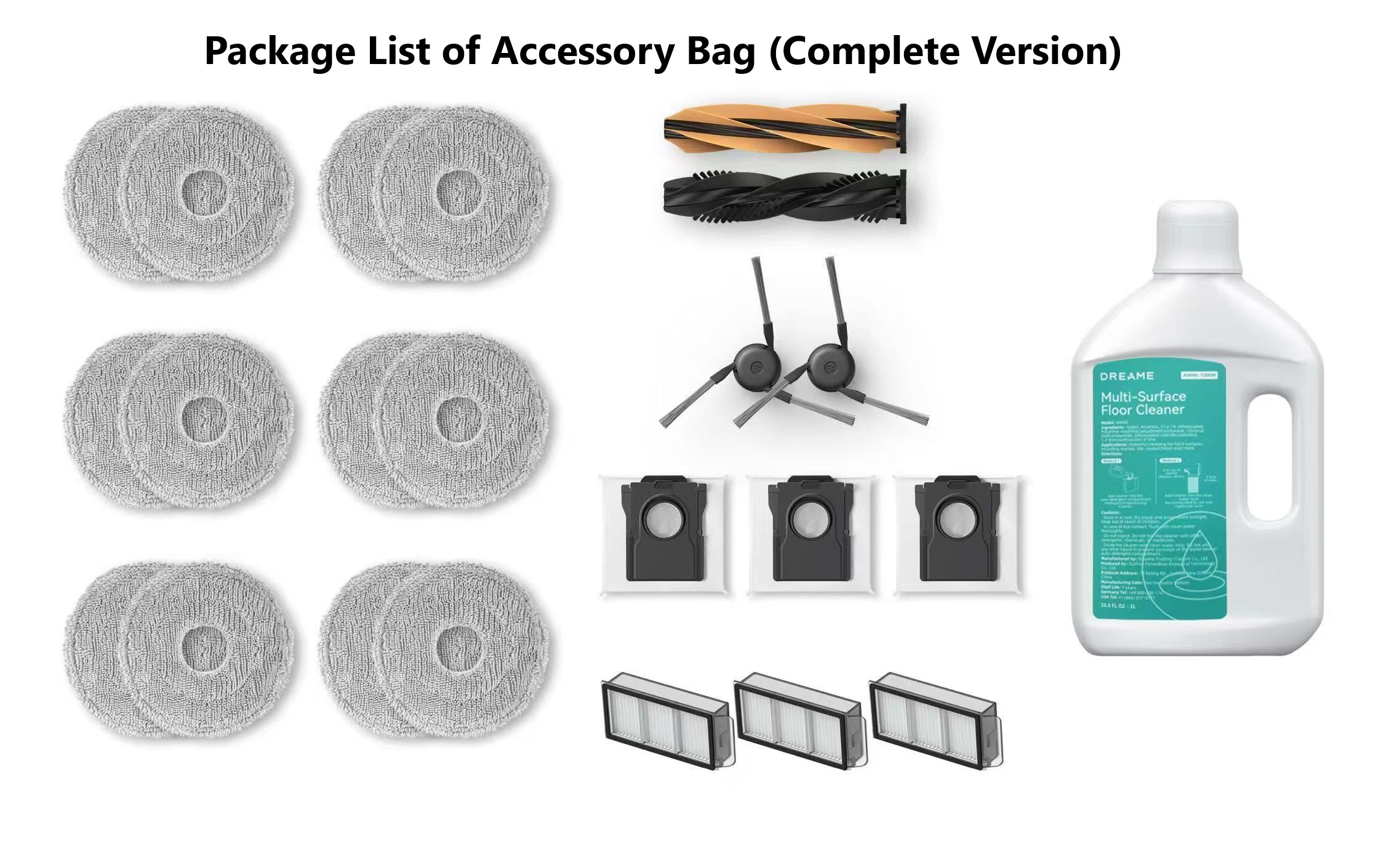 1 x X40 Ultra -robotti-imuri (Complete -versio) 1 x telakka-asema 2 x pyörivä moppi 1 x 4L käytetyn veden säiliö 1 x 4.5L puhtaan veden säiliö 1 x 3.2L pölypussi 1 x 3.2L pölypussi 1 x tarvikepussi 1 x käyttöohje |