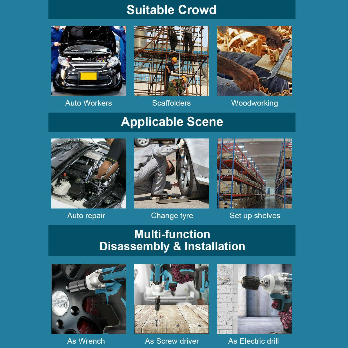 Jos työskentelet tekniikan, rakennusalan, puusepäntöiden parissa tai olet aktiivinen tee-se-itse-harrastaja, tämä väännin tarjoaa matalan melutason, roiskevesi- ja pölysuojausrakenteen sekä LED-merkkivalot turvallisuuden tueksi. Laite soveltuu käyttöön myös vaihtelevissa olosuhteissa, kuten yöllä, tuulessa ja sateessa.