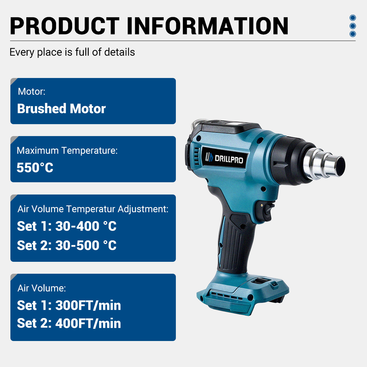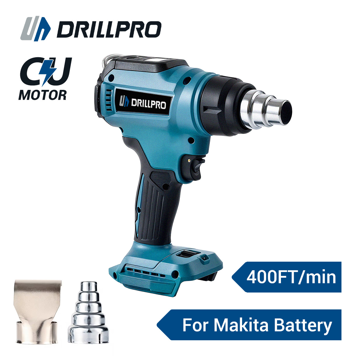 Drillpro 18V kuumailmapistooli LED-näyttö keraaminen lämmityselementti 30–650°C kutistemuovaus juotos ilman akkua