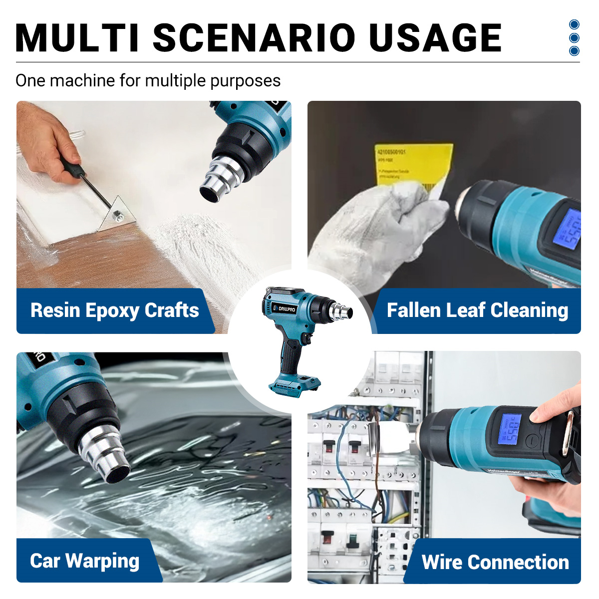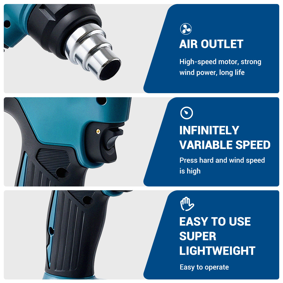 Tarjoaa jopa 550 L/min ilmavirran tehokkaaseen kutistesuojaukseen, juottamiseen ja muihin lämmitystehtäviin.