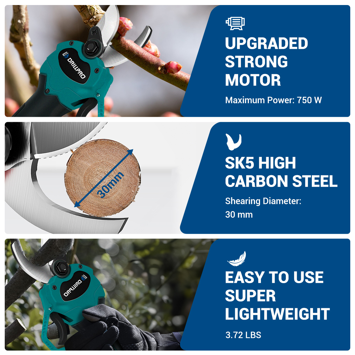 - Tehokas leikkaus: Drillpro 750W akkukäyttöiset oksasakset katkaisevat nopeasti jopa 30 mm paksut oksat, mikä tekee työstä sujuvaa ja tuottavaa.