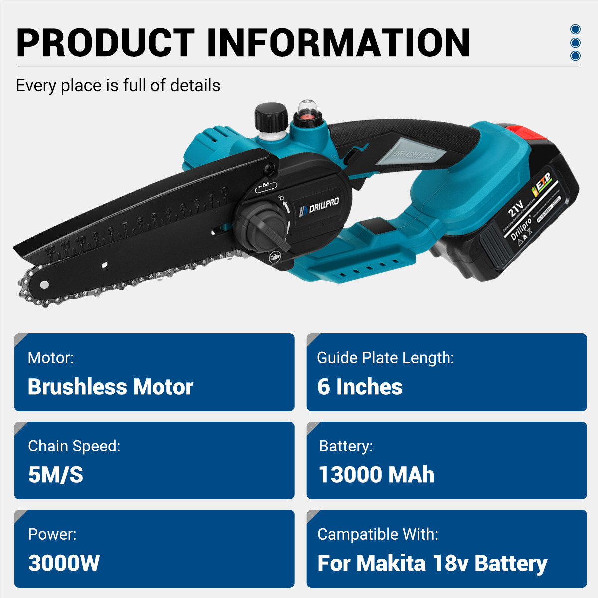 Drillpro 6-tuumainen harjaton moottorisaha 3000W sisältää akut yhteensopiva 18V-akkujen kanssa