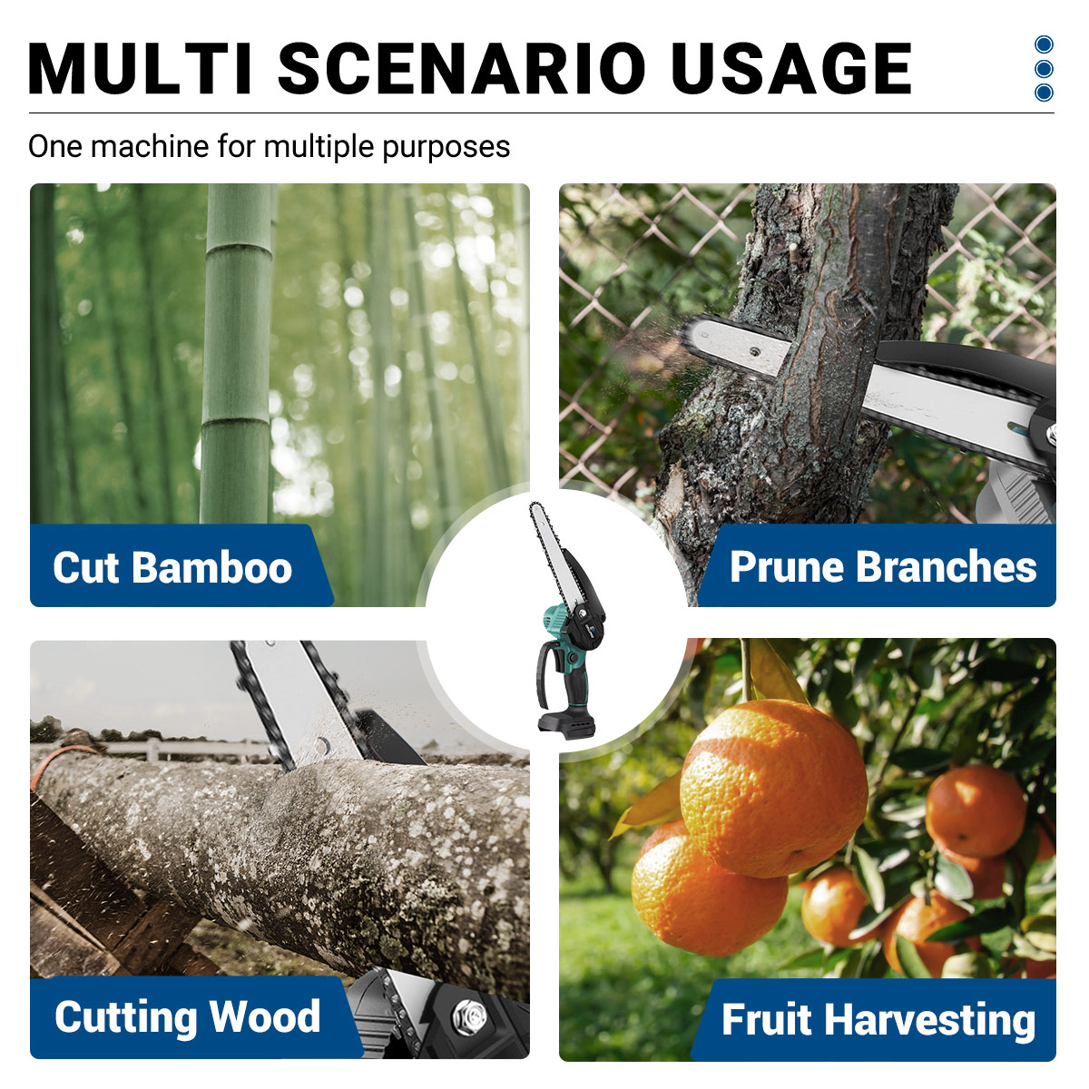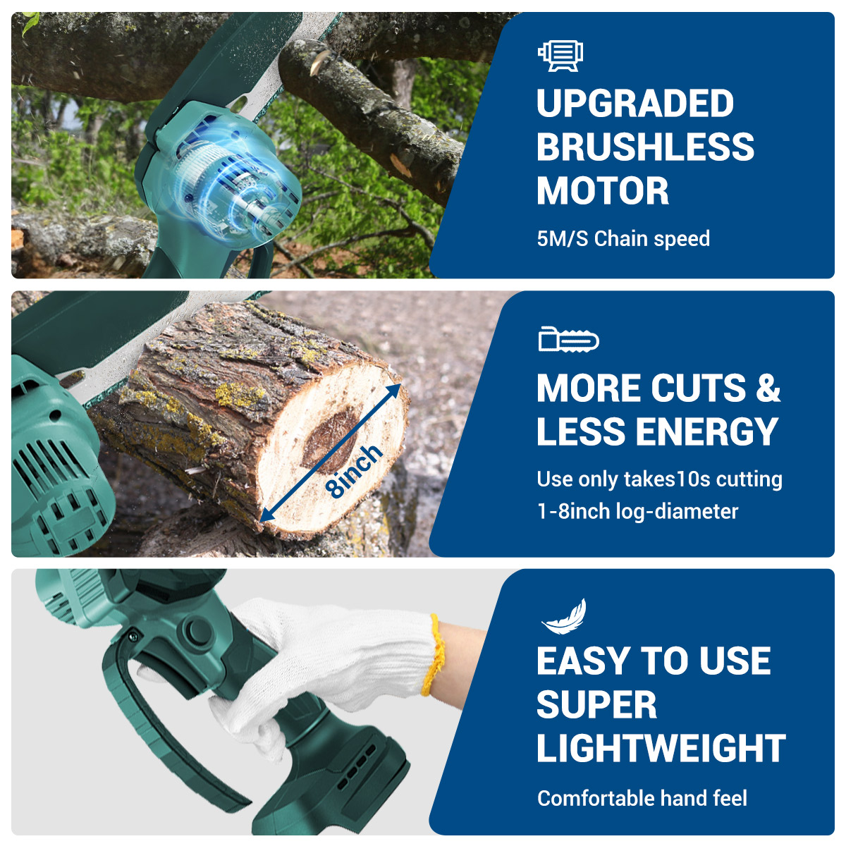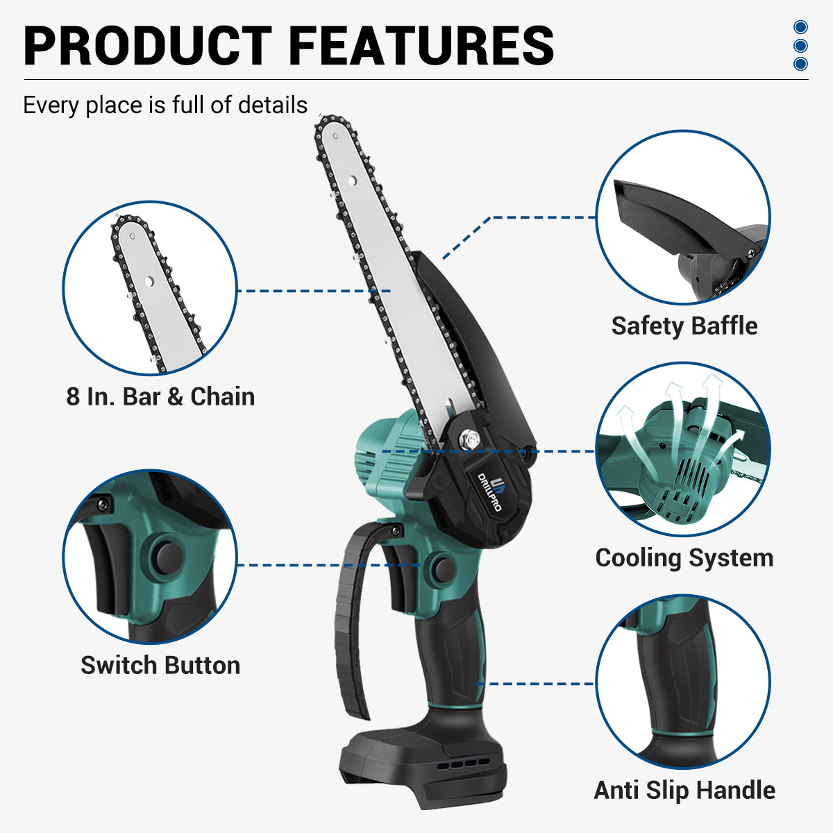 Drillpro Electric Cordless Chain Saw on kompakti ja tehokas 8-tuumainen akkusaha, joka sopii puun, oksien ja muiden puumateriaalien nopeaan katkaisuun. Harjaton moottori tuottaa 3000W huipputehon, ja kevyt, ergonominen runko on miellyttävä käyttää pidempäänkin. Runkoversio on yhteensopiva 18V akkujen kanssa.