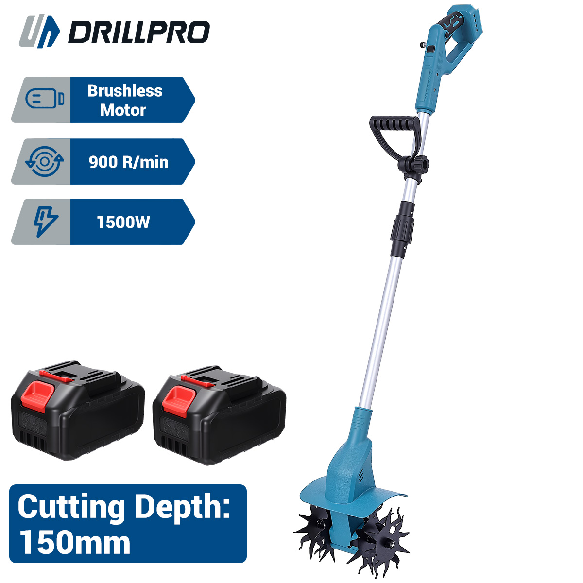 Drillpro sähköinen kultivaattori 21V 1500W harjaton moottori 150mm terä 150mm leikkuusyvyys kahdella akulla