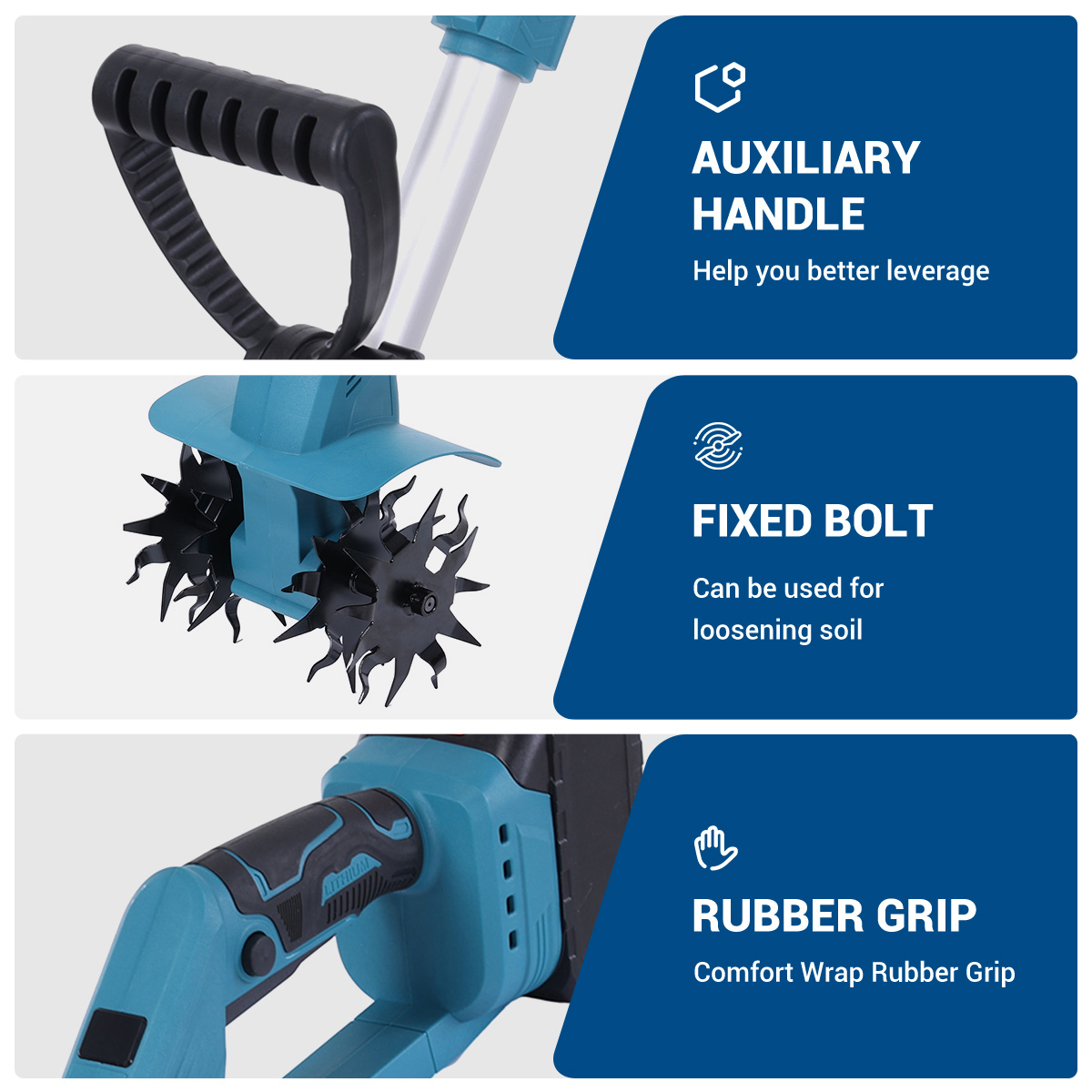 Nopea asennus kiinteillä pulteilla ja selkeät käyttöelementit. Soveltuu myös käyttäjille, joilla ei ole aikaisempaa kokemusta sähköisistä maanmuokkaimista.