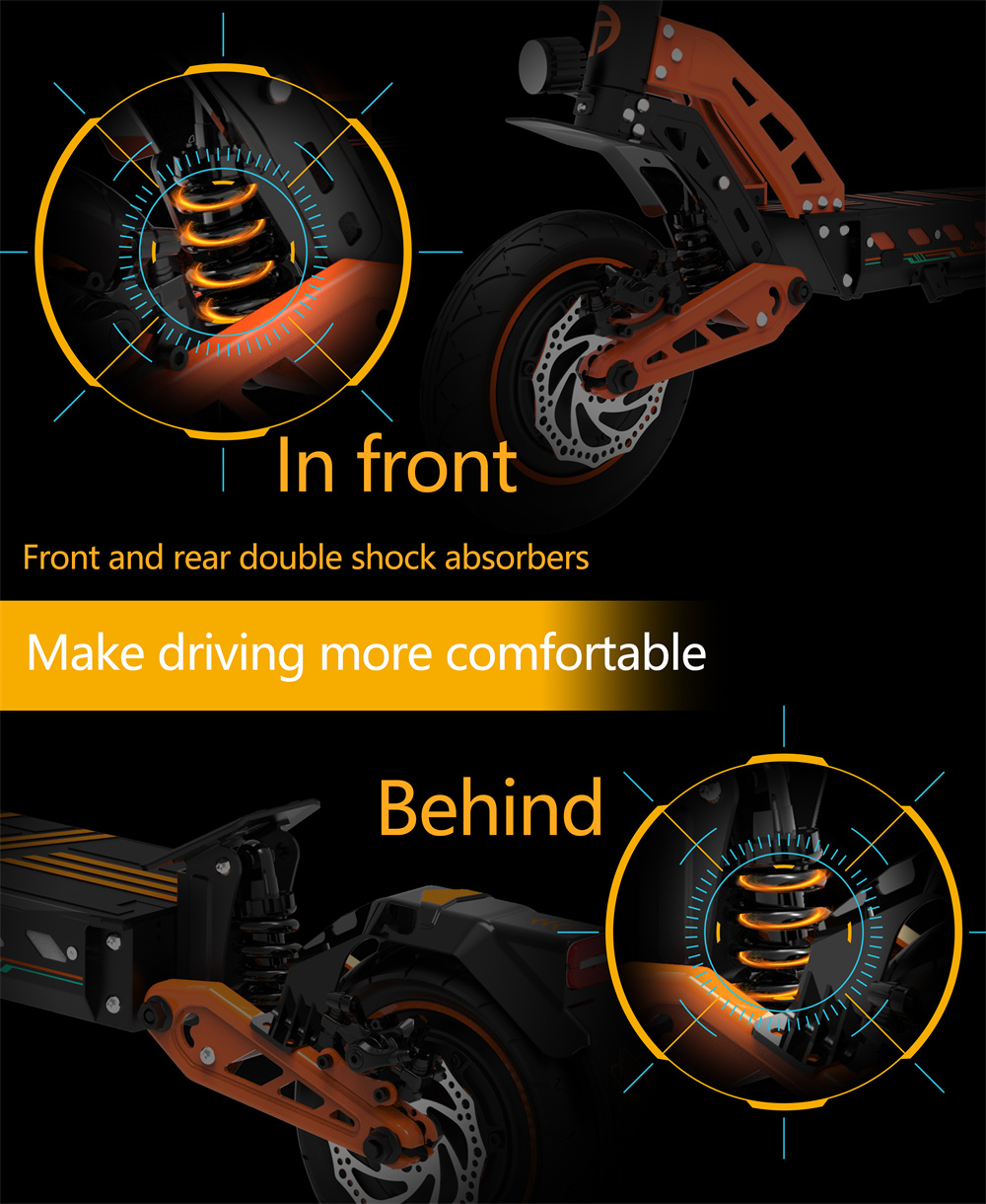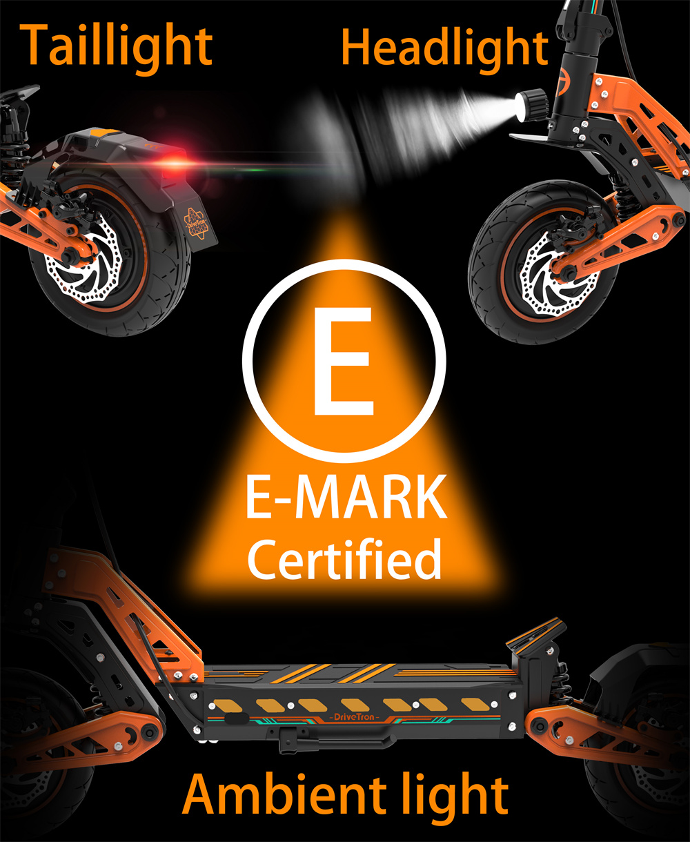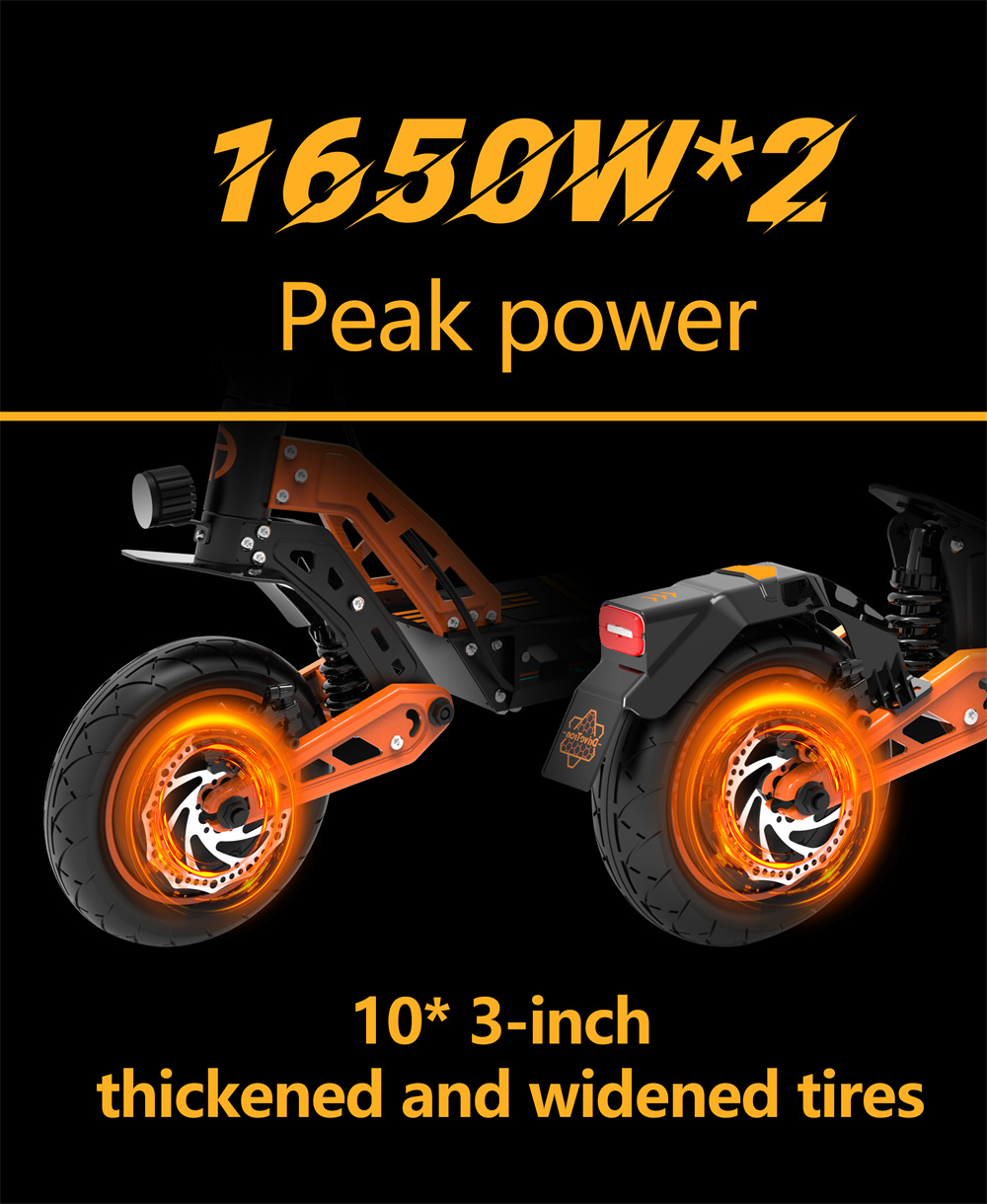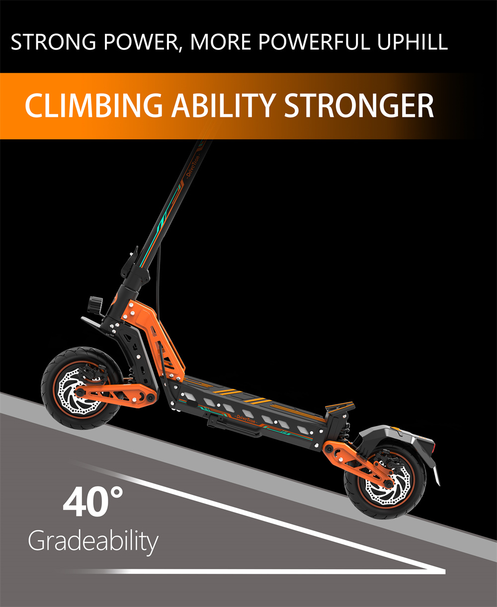 Drivetron DT10 -sähköskootteri on tehokas ja mukava valinta päivittäiseen ajoon ja vapaa-aikaan. Kaksi 1000W-moottoria (1650W*2 huipputeho), 10-tuumaiset renkaat ja edessä sekä takana olevat kaksoisiskunvaimentimet tarjoavat vakaan ajokokemuksen sekä kaupunkiin että vaihtelemmalle alustalle. Pitkä toimintamatka, tehokkaat levyjarrut ja NFC-käynnistys tekevät käytöstä helppoa ja turvallista.