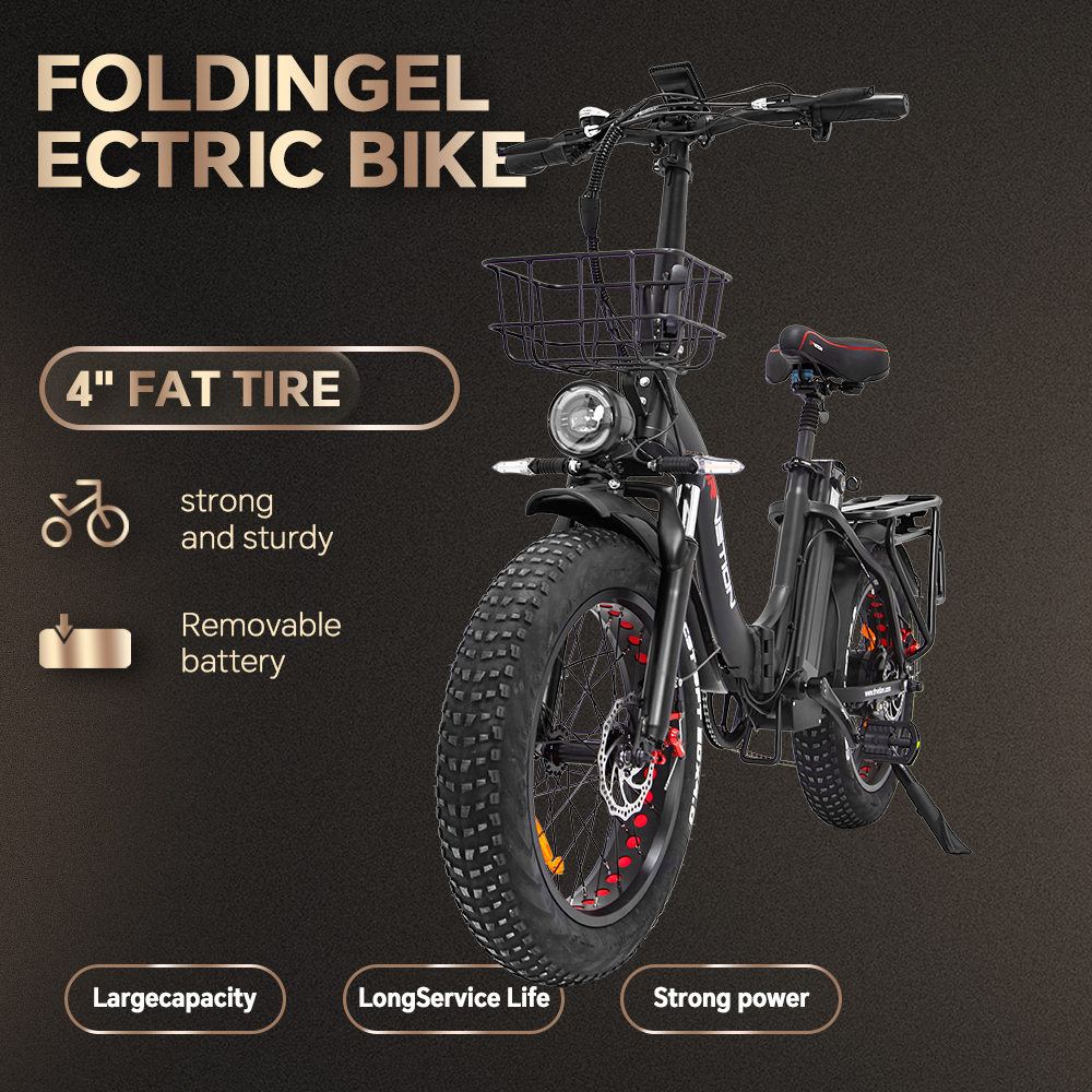 Taittuva sähköpyörä vahvalla 750W moottorilla, leveillä 20x4 renkailla, 48V15Ah akulla 45–85 km, kantaa 150 kg. Mekaaniset levyjarrut, etu- ja takajousitus, värinäyttö.