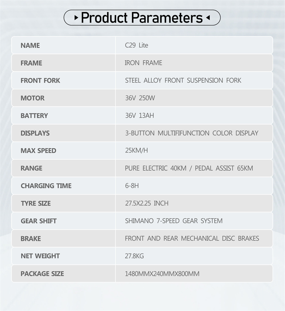 DUOTTS C29 Lite on monipuolinen sähköpyörä kaupunkiin ja kevyille maastoreiteille. 36V 250W -moottori ja 36V 13Ah -akku tarjoavat jopa 65KM toimintamatkan avustustilassa, ja mekaaniset levyjarrut tuovat varmuutta jarrutuksiin säässä kuin säässä. Etujousitettu haarukka ja leveät renkaat lisäävät ajomukavuutta epätasaisilla alustoilla.