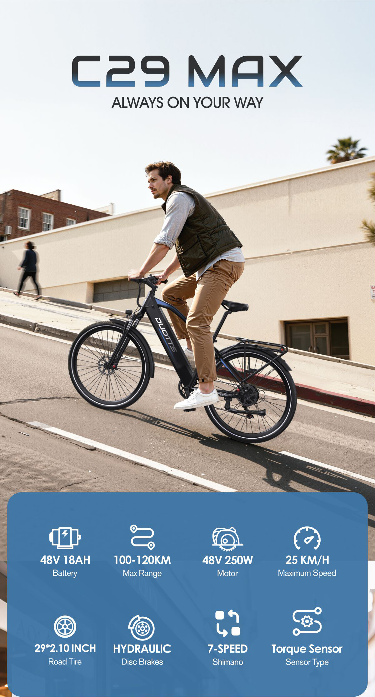 DUOTTS C29 Max on sähkömaastopyörä, joka yhdistää tukevan alumiinirungon, 29-tuumaiset renkaat ja tehokkaan 48V 250W -moottorin. Vääntöanturi, hydrauliset levyjarrut edessä ja takana sekä pitkä 48V 18Ah -akku tarjoavat miellyttävän ja hallitun ajokokemuksen niin arkeen kuin pidemmillekin retkille.