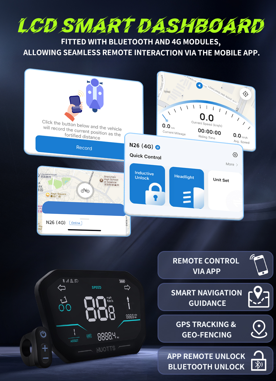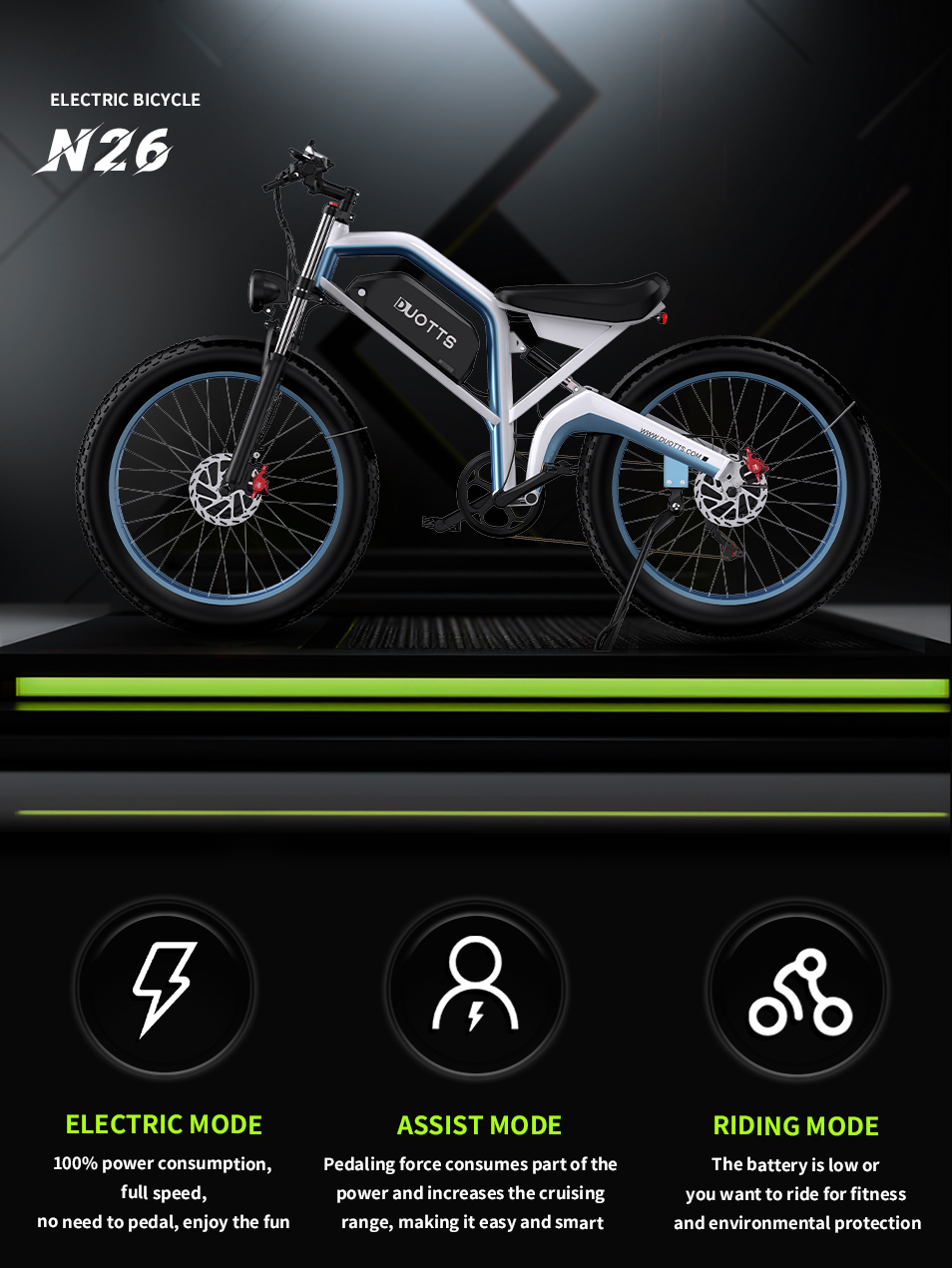DUOTTS N26 on tehokas täysjousitettu sähköfatbike, jossa on 48V 750W*2 kaksoismoottorit, leveät 26*4.0-tuumaiset renkaat ja pitkäikäinen 48V 20Ah Samsung 21700 -akku. Pyörä on suunniteltu monipuoliseen ajoon kaupunkiympäristöstä sorateille ja maastopoluille.