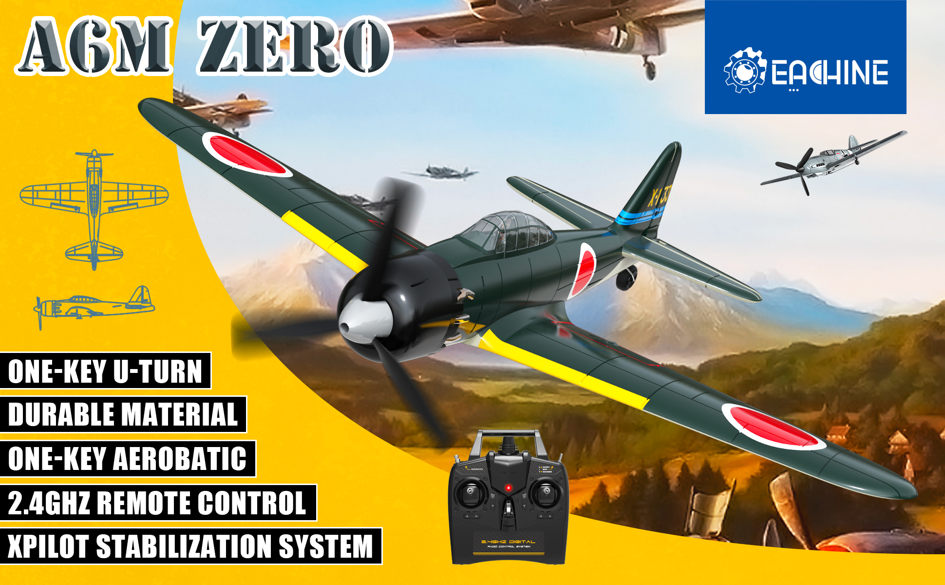 Eachine A6M Zero on pienikokoinen, valmiiksi koottu RC-lentokone aloittelijoille. Kevyt EPP-vaahdosta valmistettu rakenne ja sisäänrakennettu 6-akselinen gyroskooppi auttavat pitämään lennon vakaana ja helposti hallittavana. Sopii erityisesti ensimmäiseksi radio-ohjattavaksi lentokoneeksi ulkolentoon.