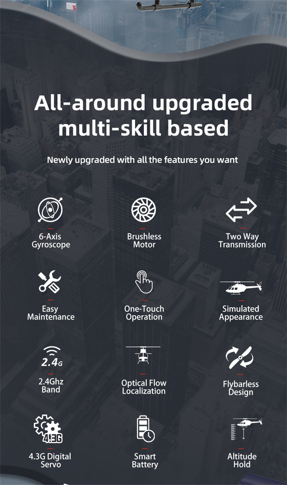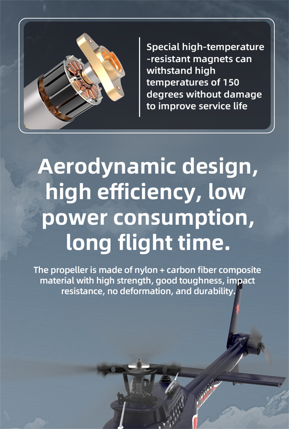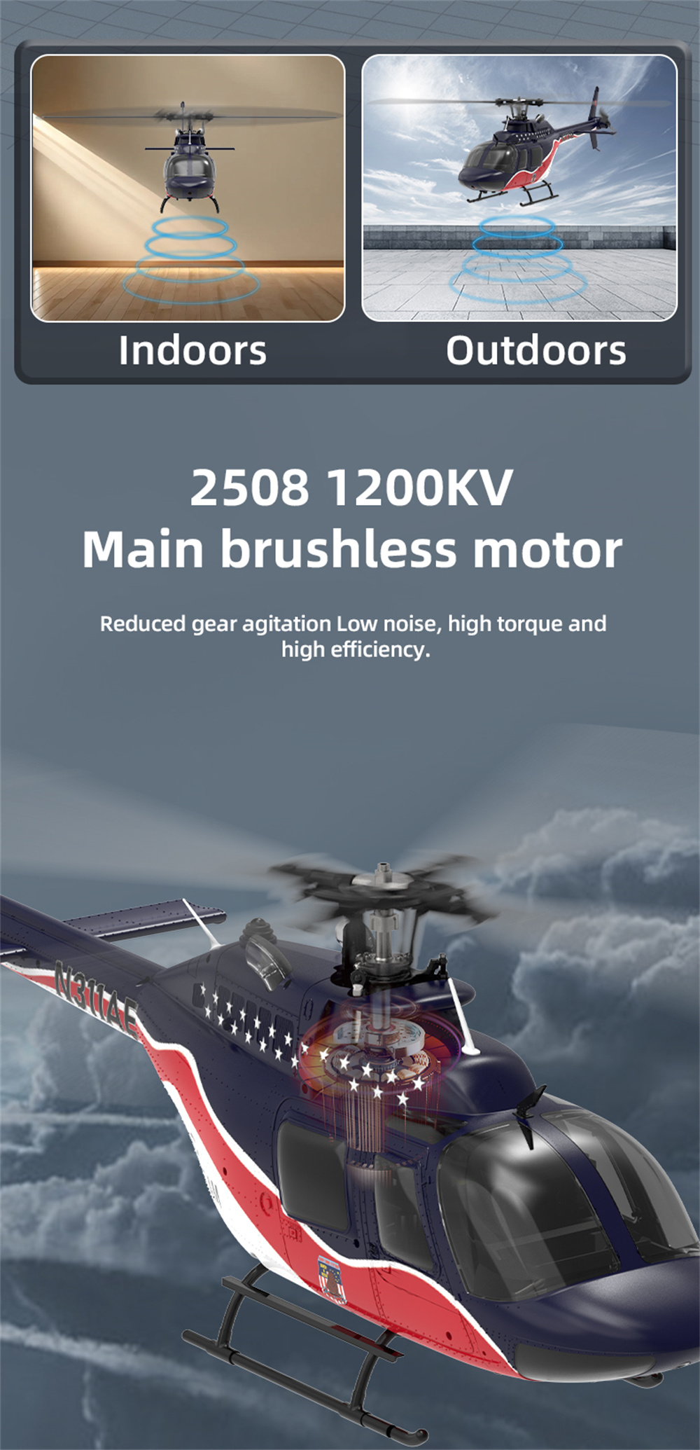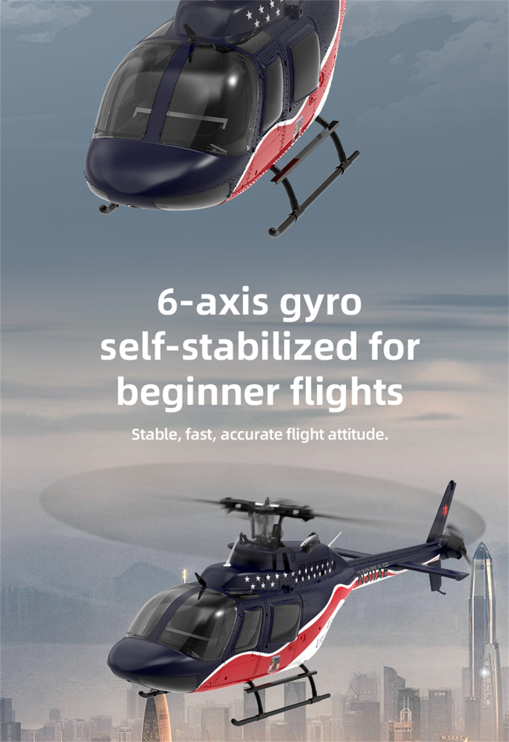 – Flybarless-rakenne, kaksoisakselin yhteiskäyttömoottori ja elektroninen vakautusjärjestelmä rauhalliseen ja tarkkaan lentoon.