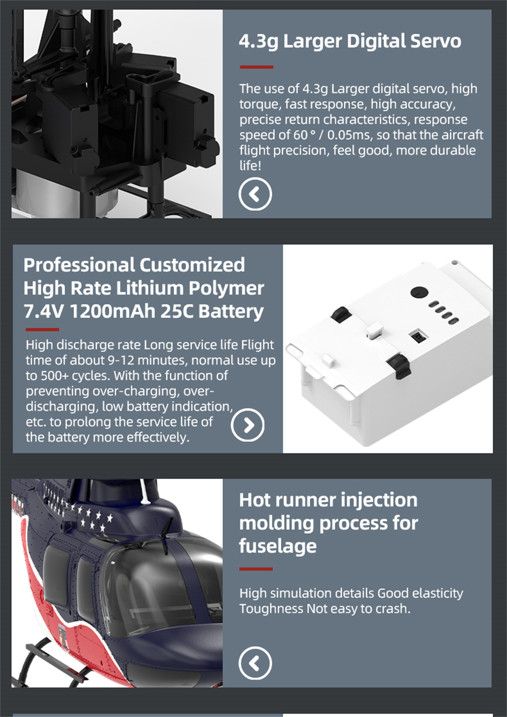 6> Käytössä on suurennettu 4.3g metalliratasservo, jossa on korkea vääntömomentti, nopea reagointi, tarkkuus ja täsmällinen palautus keskiasentoon. Vasteaika on 60°/0.05ms, mikä tekee lennosta tarkkaa, ohjaustuntumasta hyvän ja käyttöiästä pitkän. Kolmen servon ansiosta laite pystyy lentämään tarkasti myös ulkona 4–5 m/s tuulessa.