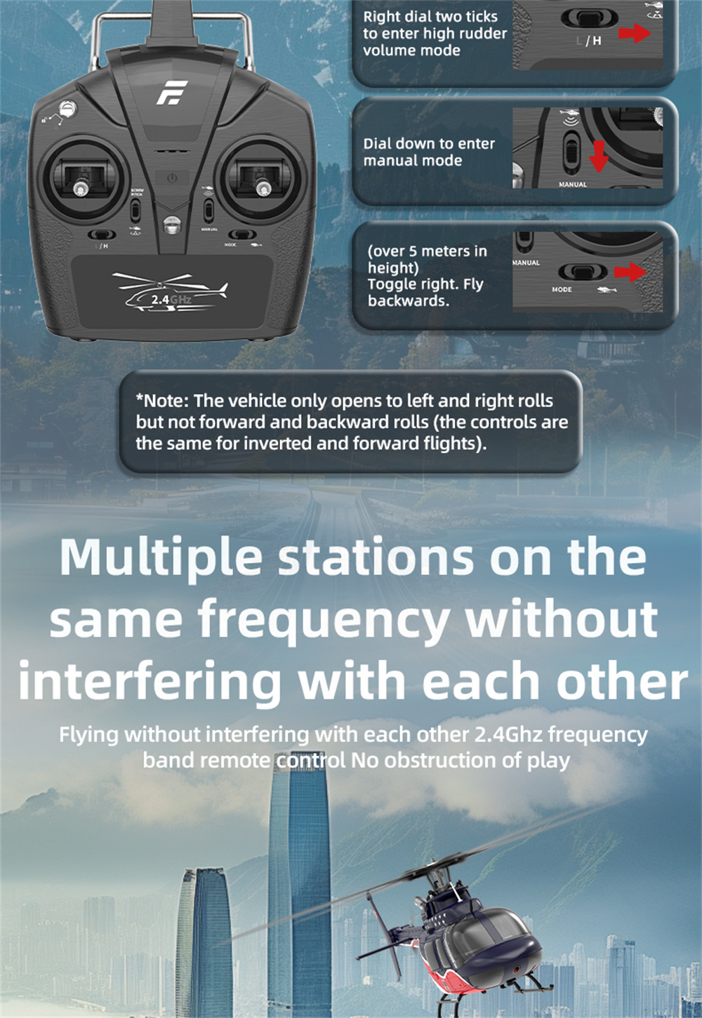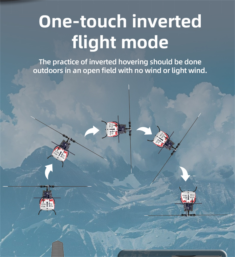 9> Älykäs korkean lentokorkeuden yhdellä painikkeella toimiva selkä lentotila. Selkä- ja normaalilennon ohjauslogiikka on sama, joten aloittelija voi helpommin opetella selkälennon ohjausperiaatteet ja suunnan hallinnan.