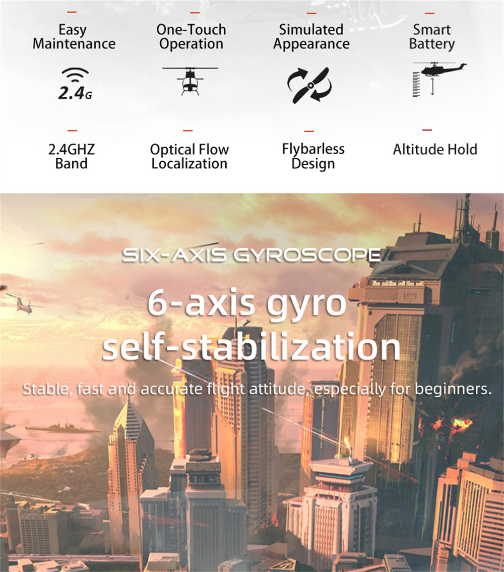 - 6-akselinen gyroskooppi sekä optinen virtaus- ja ilmanpainekorkeuslukitus helpottavat aloittelijan lentämistä