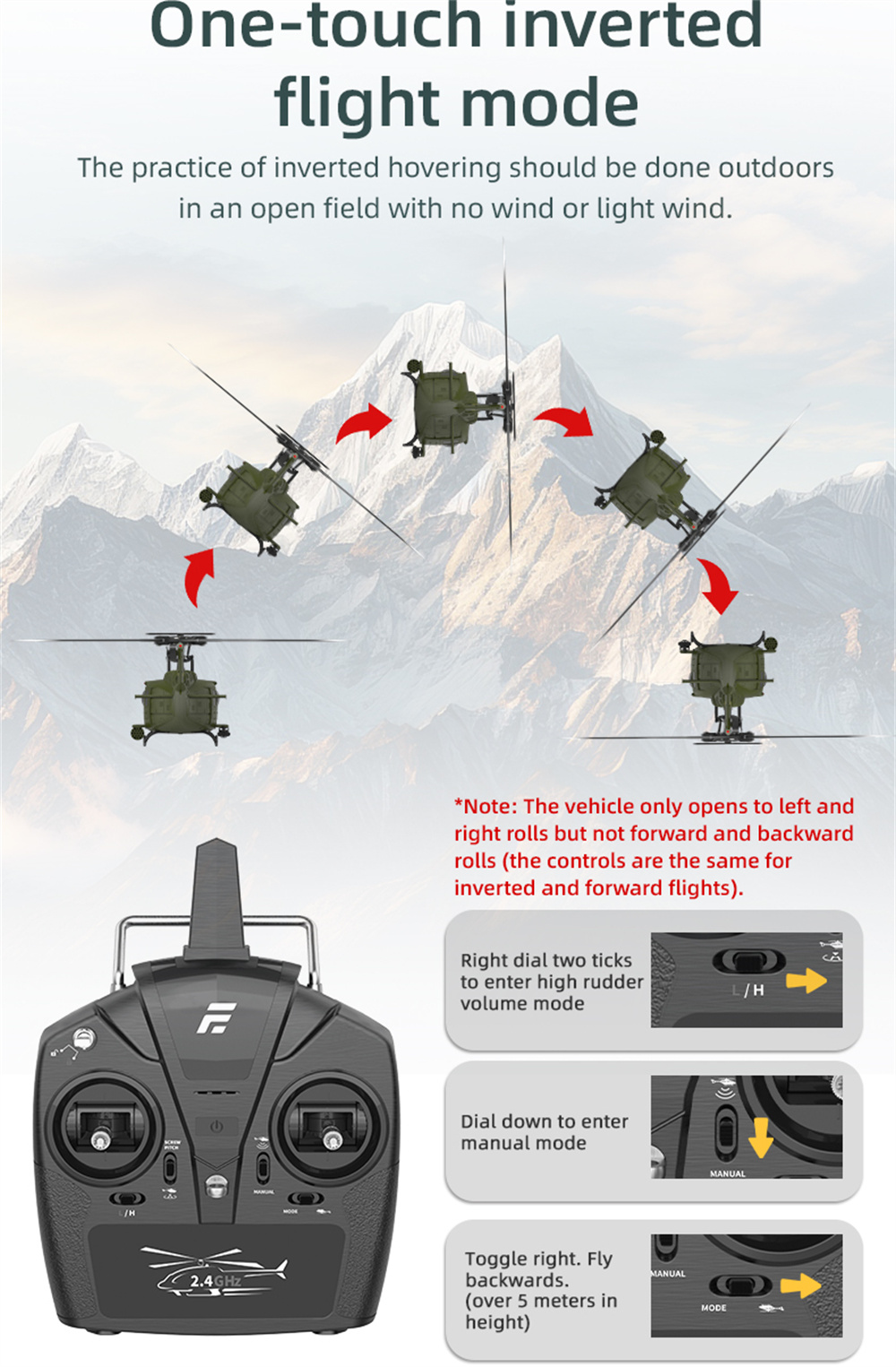 9> Älykäs yhden painikkeen ylösalaisinlento korkeudensäädöllä: ylösalaisinlennon ohjaus on samanlainen kuin normaali lento, jolloin aloittelijat voivat helposti oppia ylösalaisinlennon perusasiat ja suunnanhallinnan.
